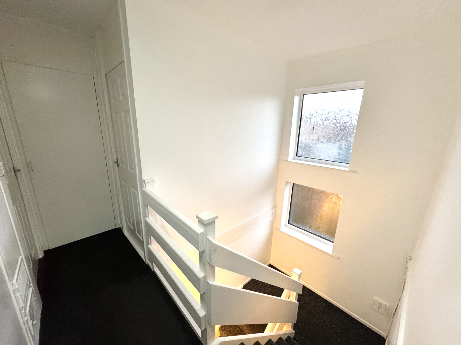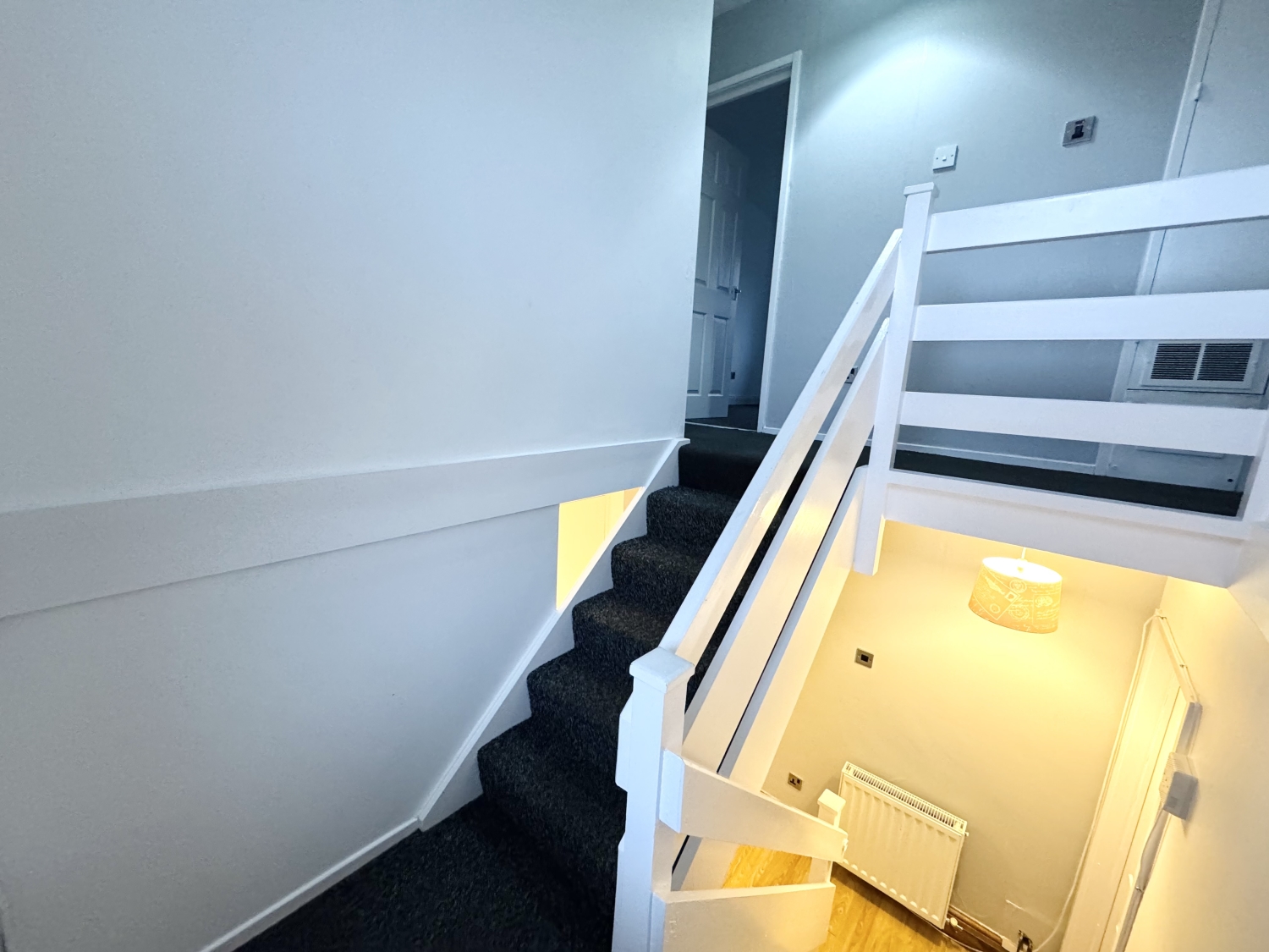 UPVC Door, two storage cupboards, radiator, stairs leading to the first floor landing