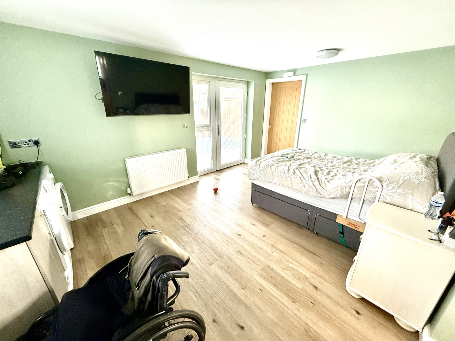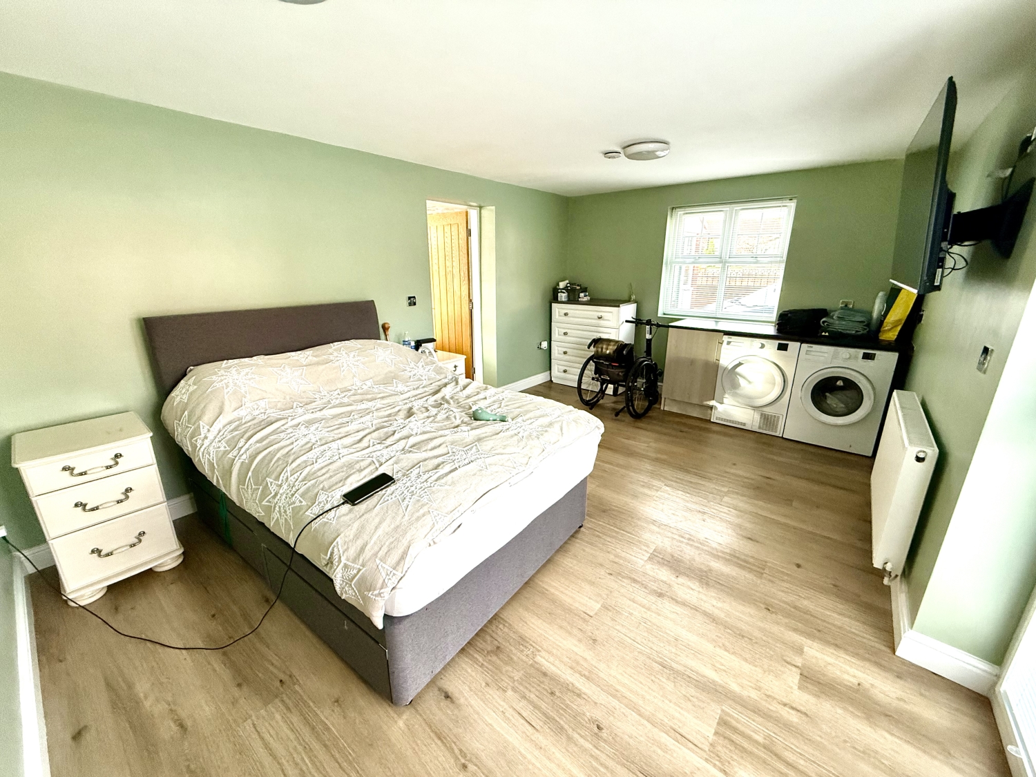 UPVC double glazed French doors leading to the garden, laminate flooring, radiator, utility area with fitted worktop, base unit and space for tumble dryer and washing machine.