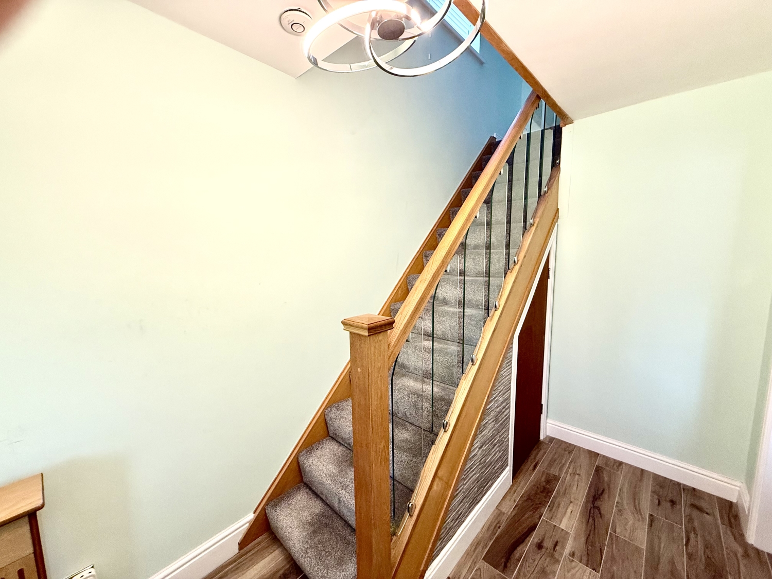 Stairs to the first floor, under stairs storage cupboard, laminate style tiled flooring and single central heating radiator.