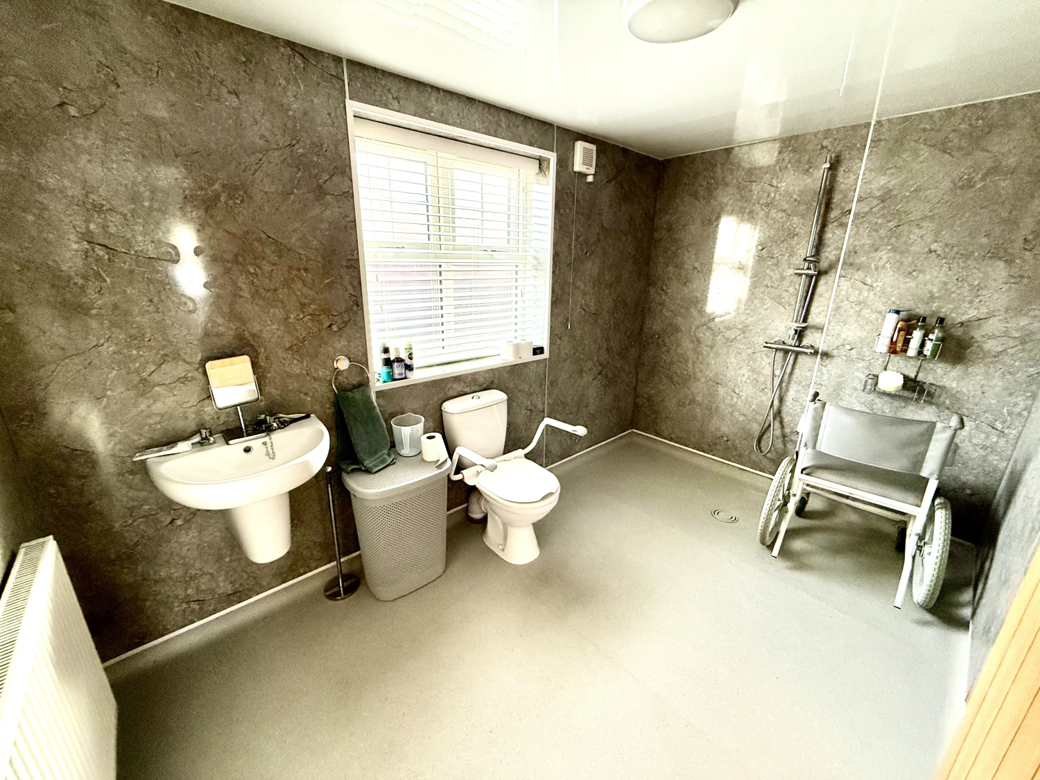 Shower area with chrome shower, wash hand basin with chrome dual taps, low level WC, panelling to walls and ceiling, double glazed window to the rear and extractor fan.