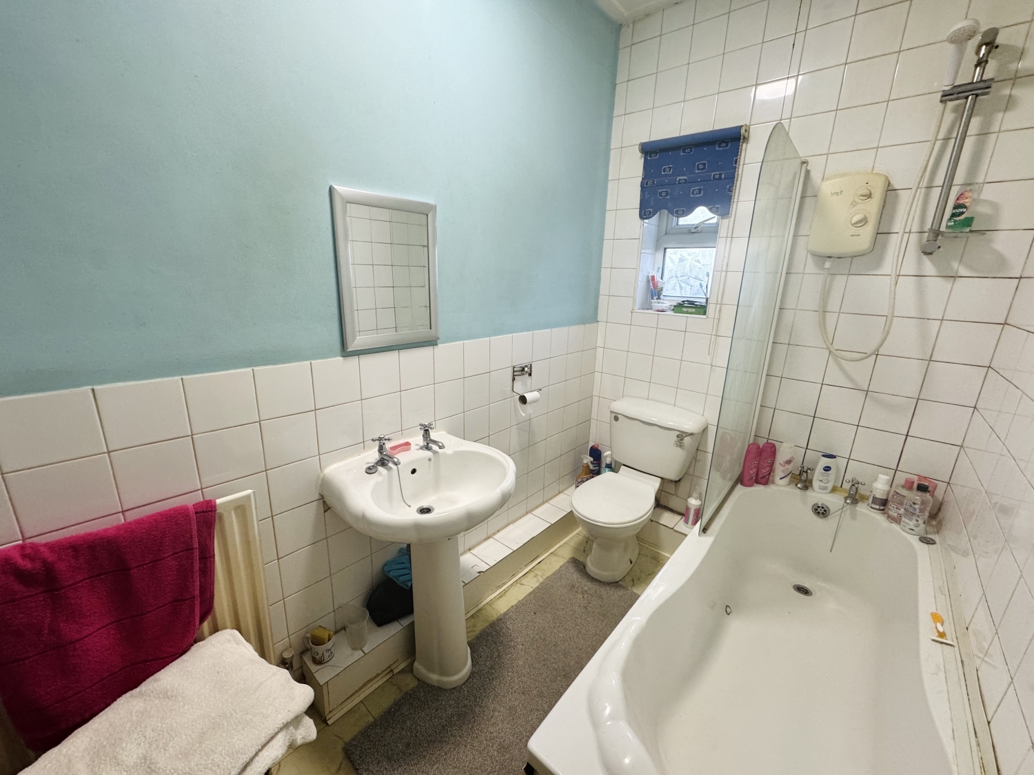 Fitted with a 3 piece suite comprising of; Bath with overhead shower, pedestal wash hand basin, low level w/c, radiator, part tiled walls, double glazed window to the rear elevation