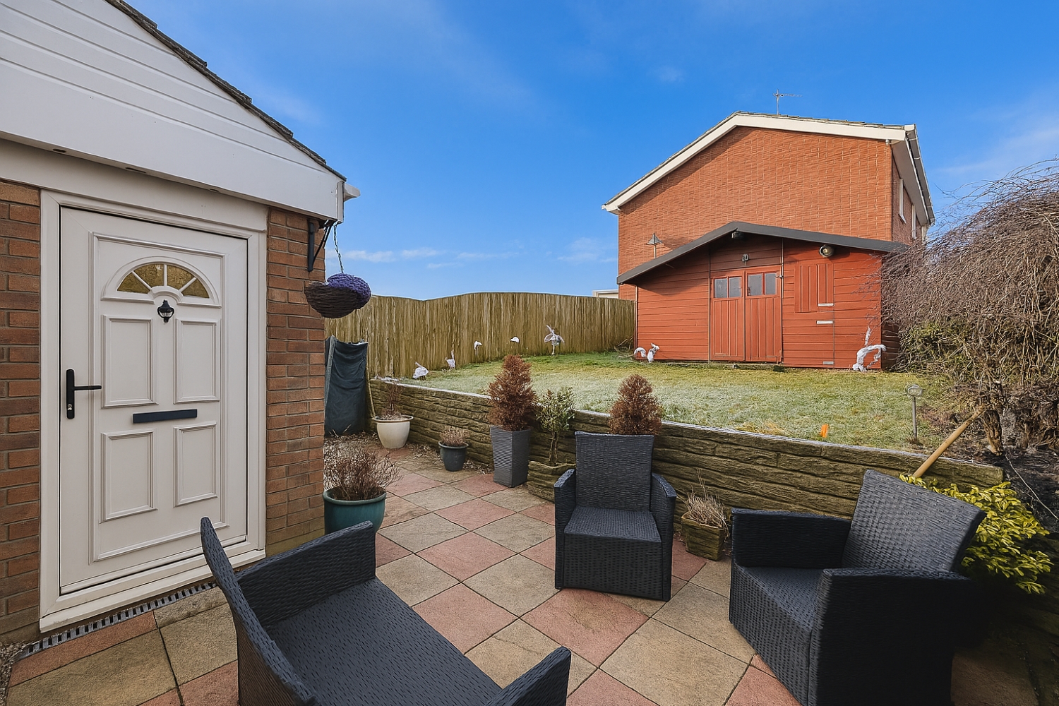 The rear garden is a standout feature, enjoying a desirable south/east‑facing aspect that captures the morning and early afternoon sun. Laid mainly to lawn with a patio area ideal for seating, it also includes a shed with power—perfect for storage, hobbies, or even a small workshop.