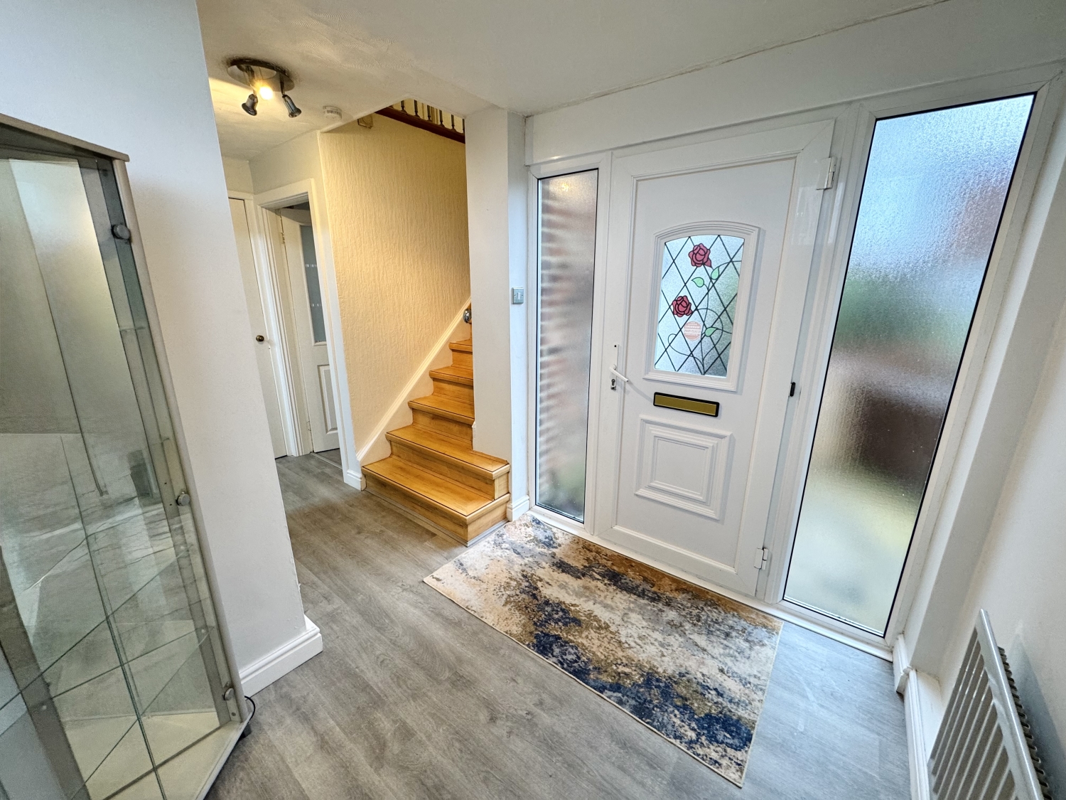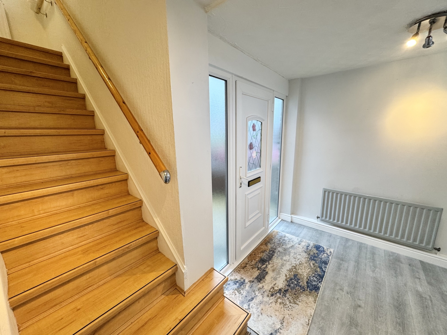 UPVC Door, storage cupboard, 2x radiators, stairs leading to the first floor landing