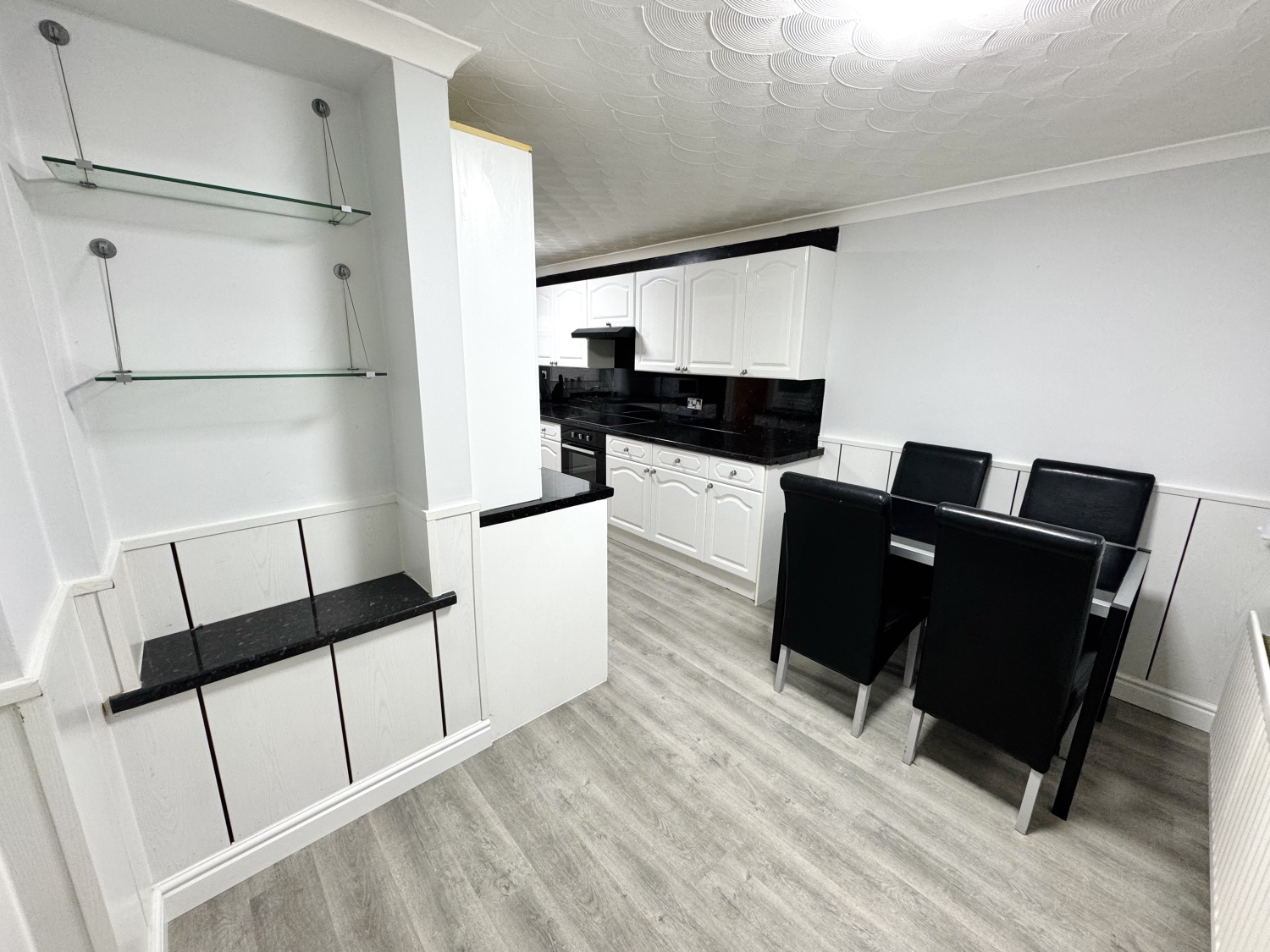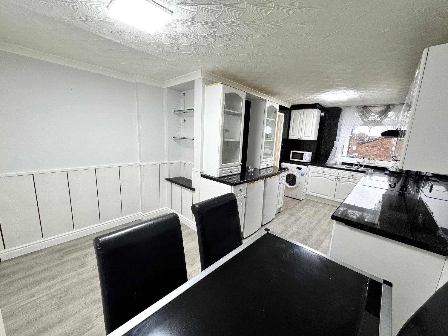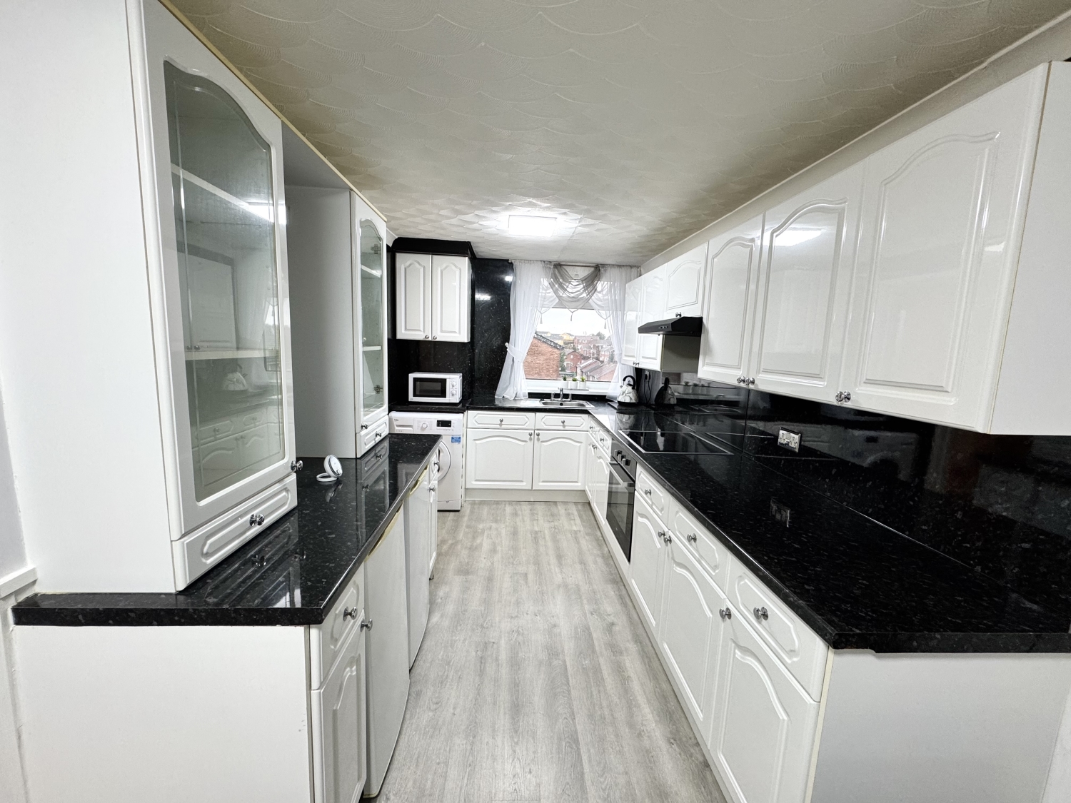 Fitted with a range of wall and base units with complementing work surfaces, Bosch electric hob, electric oven, extractor hood, fridge, freezer, stainless steel sink with drainer and dual tap, space for washing machine, radiator, double glazed windows to both the front and rear elevation