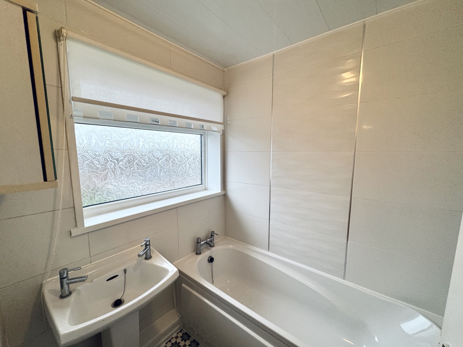 Fitted with a 2 piece suite comprising of; Bath, pedestal wash hand basin, heated towel rail, tiled walls, tiled flooring, double glazed window to the front elevation