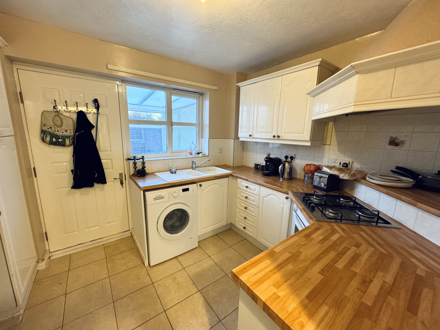 Fitted with a range of wall and base units with complementing work surfaces, splash back tiling, gas hob, electric oven, extractor hood, composite sink with drainer and mixer tap, space for fridge, storage cupboard, space for washing machine, radiator, double glazed window to the rear elevation, door access into conservatory