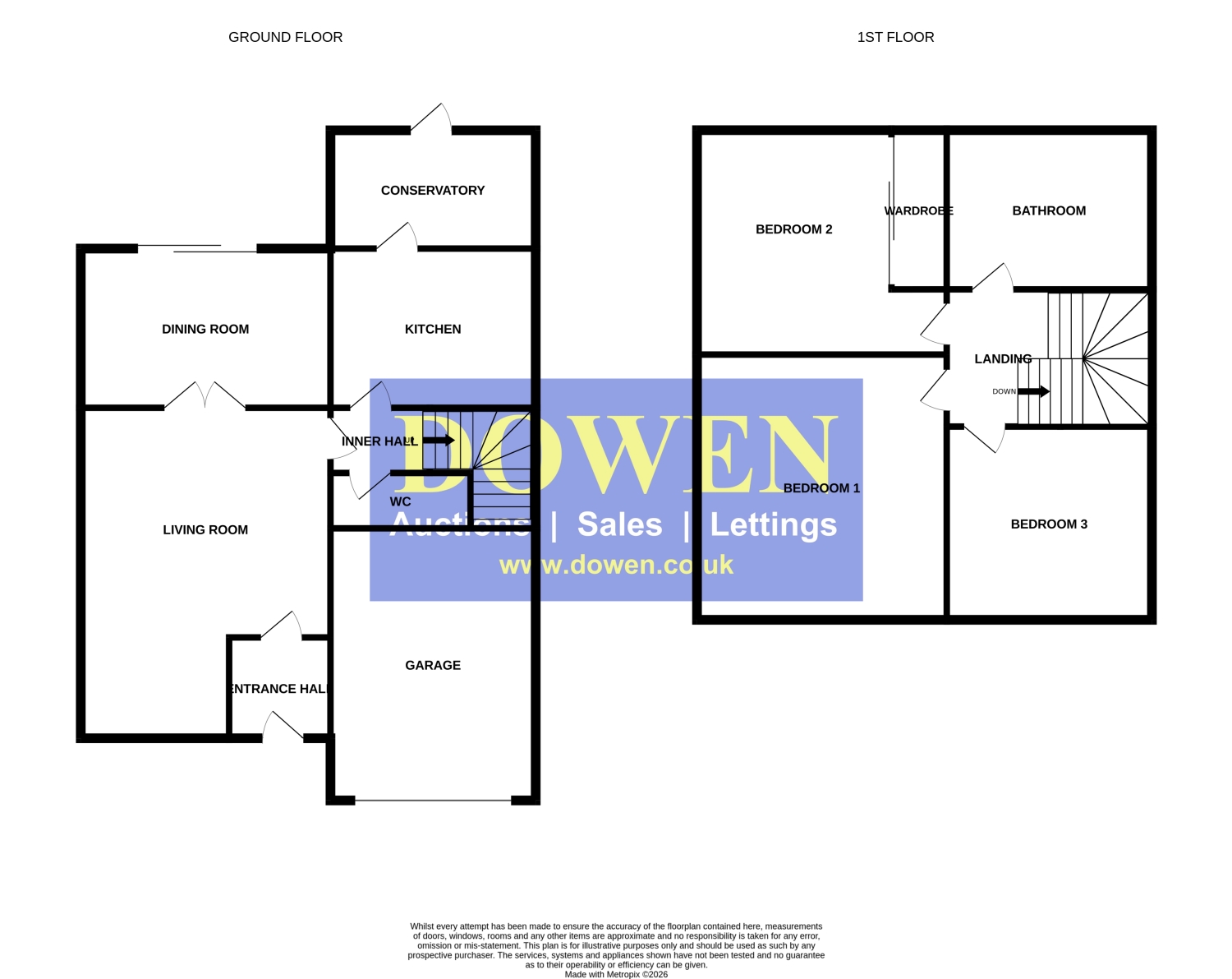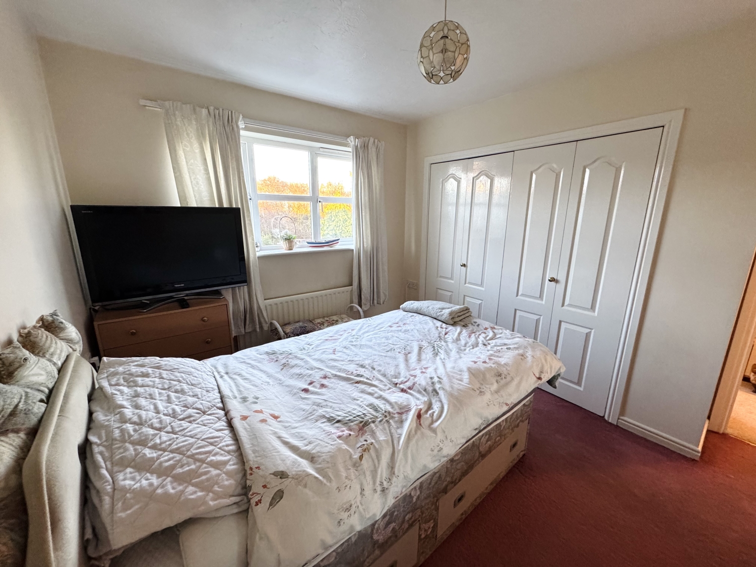 The first‑floor landing leads to three well‑proportioned bedrooms. Bedroom two benefits from built‑in wardrobes, offering useful storage without compromising floor space. All bedrooms are served by a spacious four‑piece family bathroom, complete with bath, separate shower, basin and w/c, providing a well‑equipped suite for the household.