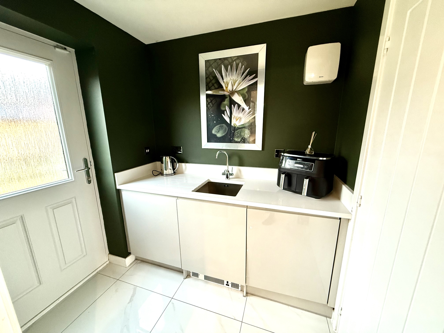 Fitted with the high gloss 'dove grey' base units, having quartz working surfaces and a stainless steel sink unit. Rear entrance door, downlighters and porcelain tiled flooring.