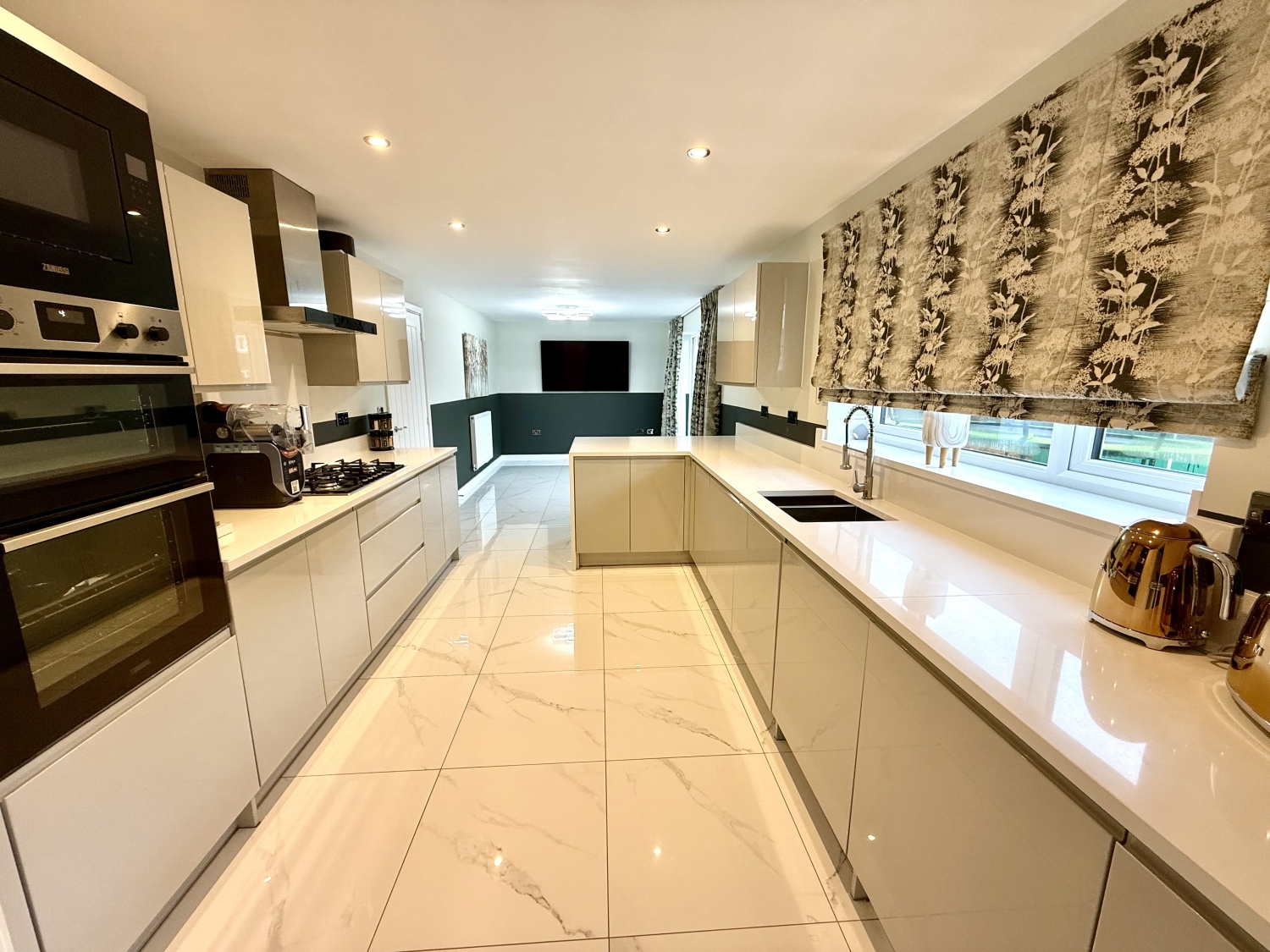Fitted with a top range of the 'Dove Grey' high gloss wall and base units, having quartz working surfaces with waterfall edges, incorporating a stainless steel sink unit with spray mixer tap. Double glazed UPVC window to the rear, double glazed UPVC French doors with double glazed side panel windows, central heating radiator, porcelain tiled flooring, built in double oven, microwave, five ring gas hob, state of the art extractor hood, kickboard heating.