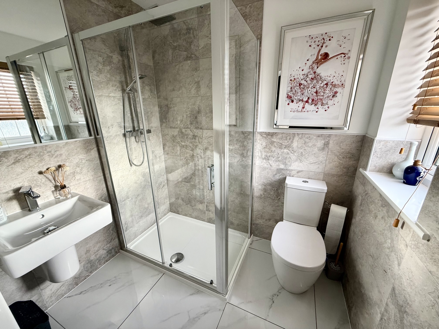 Fitted with an upgraded three piece suite comprising a walk in shower cubicle, wash hand basin and WC. Double glazed frosted window to the rear, beautiful modern splashback tiling, tiled flooring and central heating radiator.