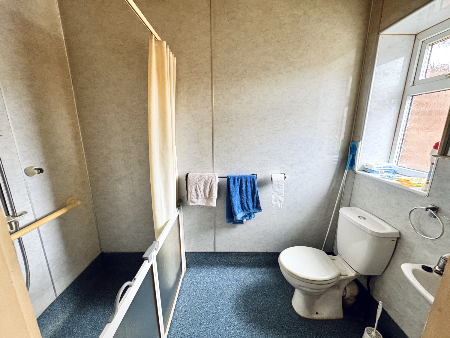 Fitted with electric shower, wash hand basin, low level w/c, double glazed window to the rear elevation