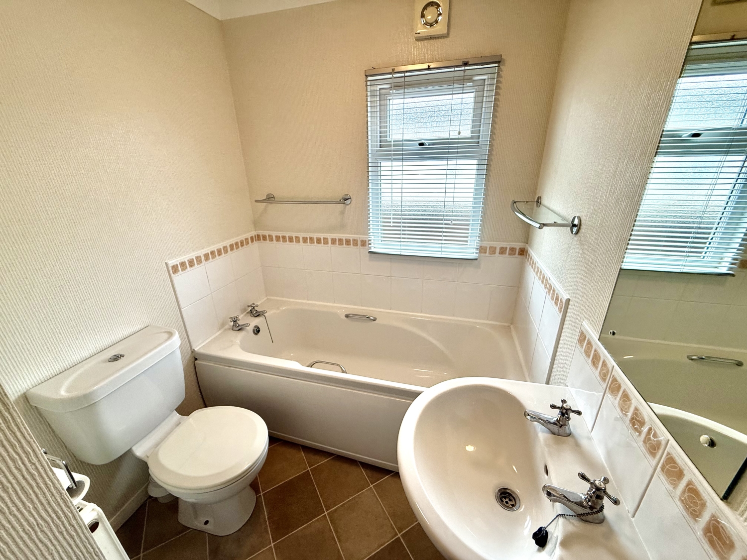 Fitted with a white three piece suite comprising a low level WC, wash hand basin, splashback tiling, double glazed frosted window to the side, coved ceiling, extractor fan and central heating radiator.