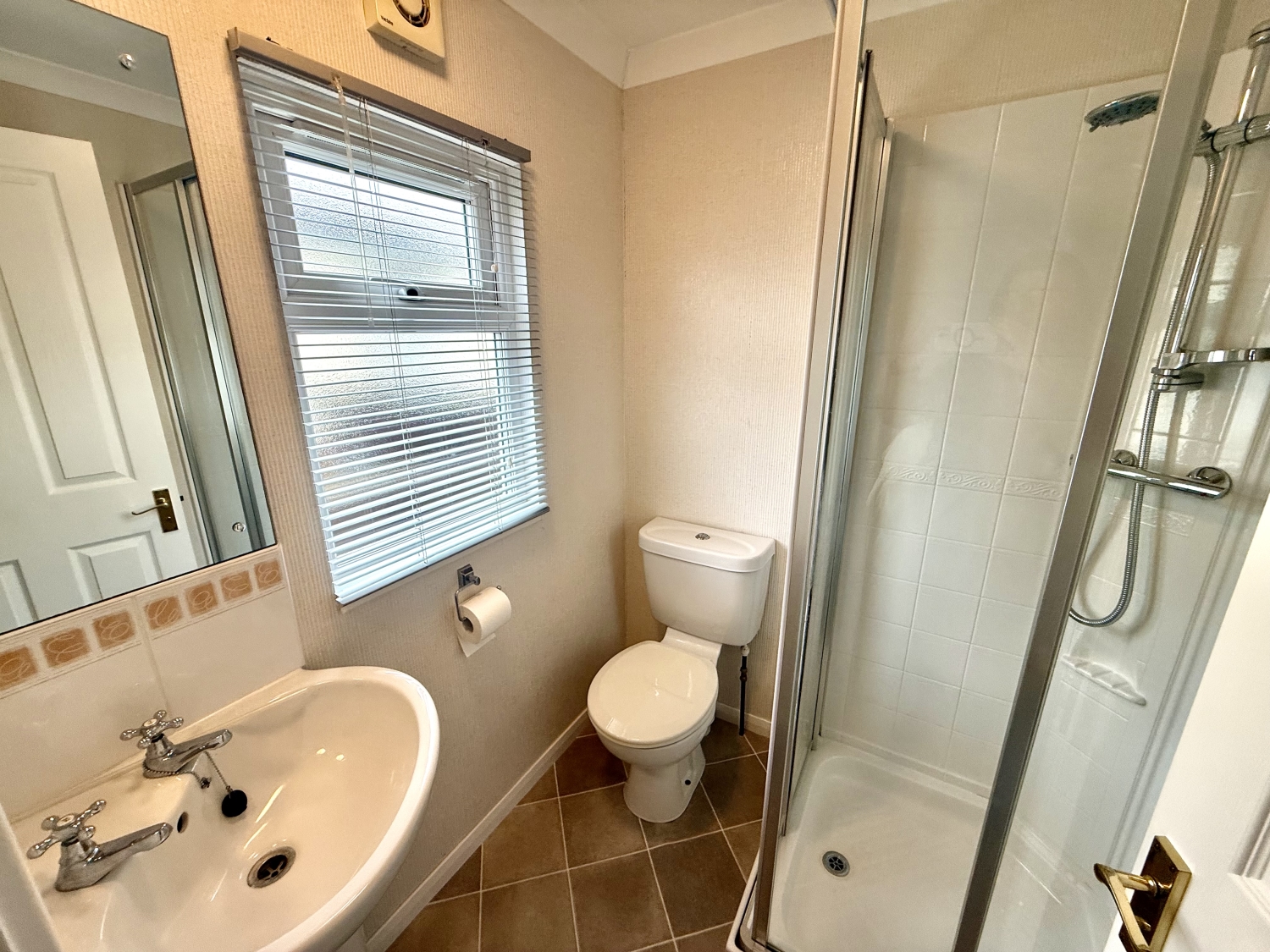 Fitted with a white three piece suite comprising a walk in shower cubicle, pedestal wash hand basin and low level WC. Double glazed frosted window to the side, splashback tiling, extractor fan, coved ceiling and central heating radiator.