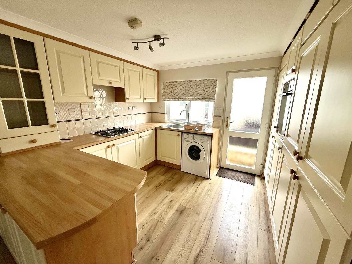Fitted with an excellent range of the 'cream shaker' wall and base units, having contrasting work surfaces, incorporating a stainless steel sink unit with mixer tap and drainer. Double glazed window to the side, UPVC external door, built in four ring gas hob, extractor hood, splashback tiling, splashback tiling, laminate flooring, built in oven, integrated fridge and freezer and washing machine to be included in asking price.