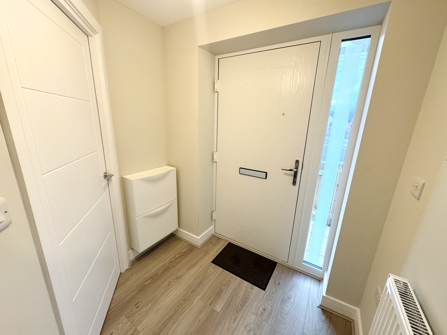 Composite door, radiator, laminate flooring, stairs leading to the first floor landing