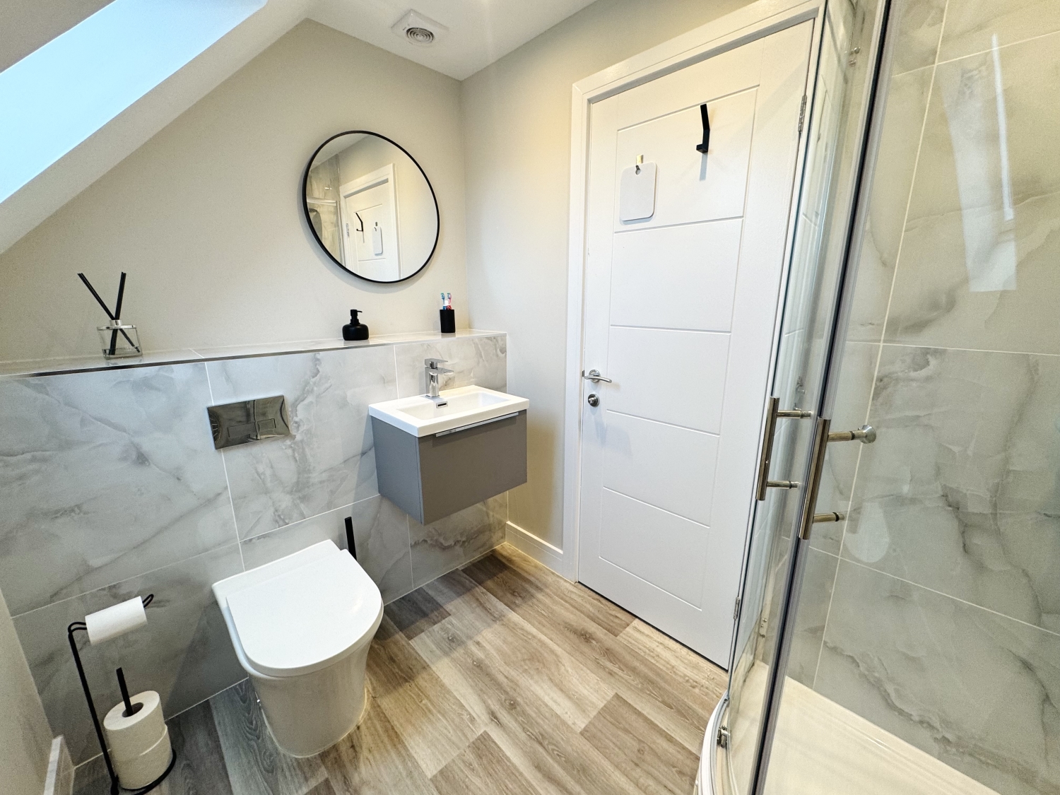 Occupying the entire top floor, the master bedroom is a luxurious retreat. A front-facing window provides open views, while the space includes a dedicated dressing area and access to a stylish en-suite shower room. The en-suite is fitted with a shower cubicle with mains shower, vanity basin, low-level WC, and a Velux window to the rear, creating a bright and welcoming space.