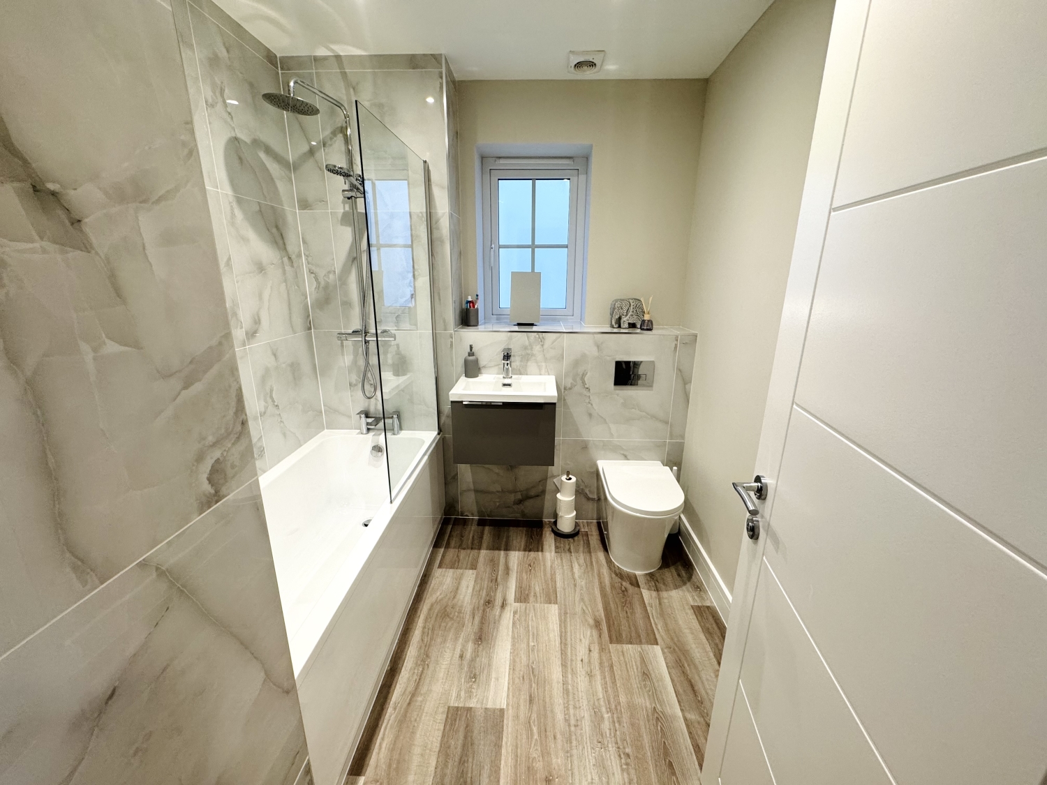 Fitted with a 3 piece suite comprising of; Bath with overhead mains shower, vanity wash hand basin, low level w/c, extractor fan, heated towel rail, spotlights to ceiling, part tiled walls