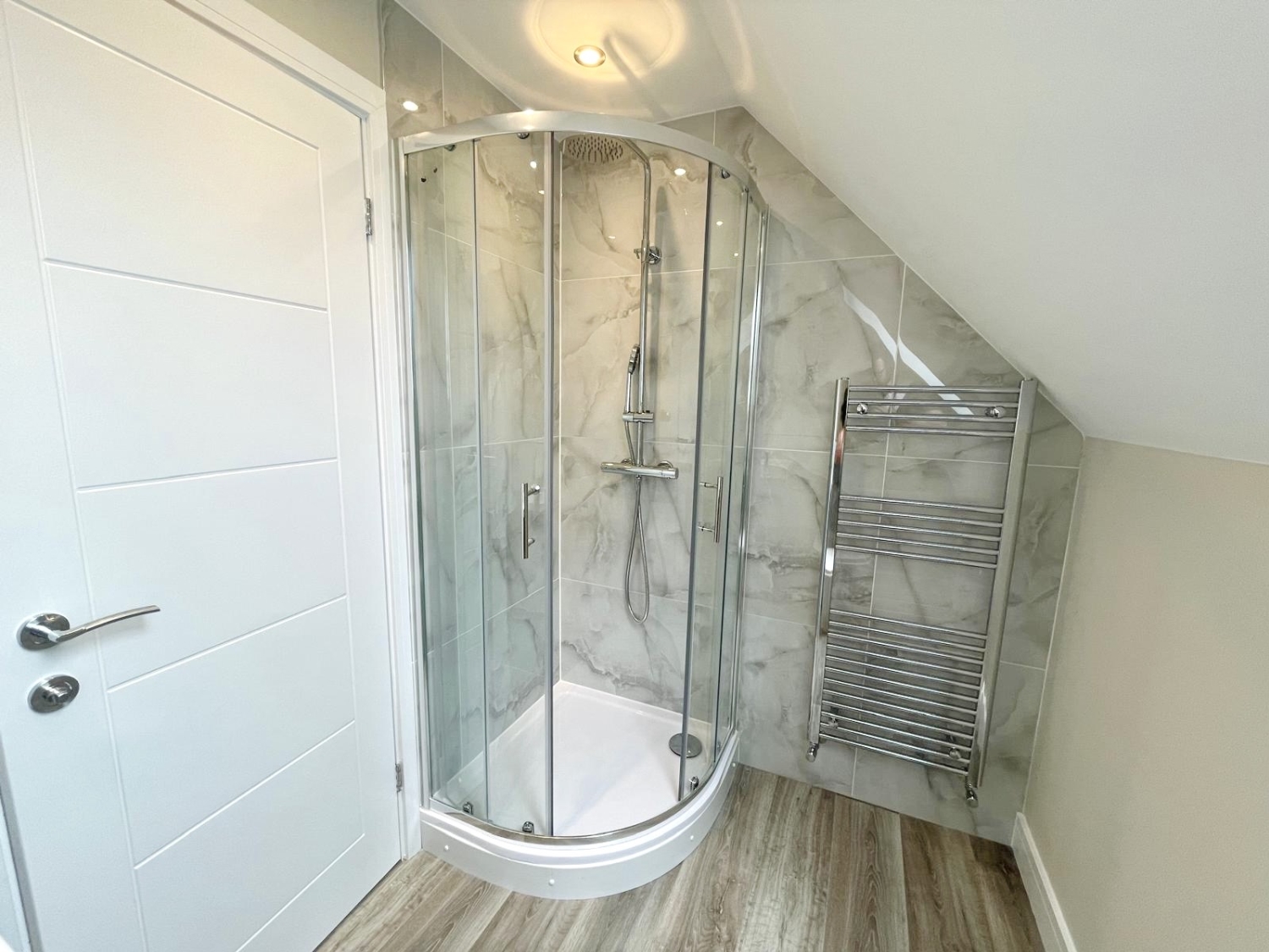 Fitted with a 3 piece suite comprising of; Shower cubicle with mains supply, vanity wash hand basin, low level w/c, heated towel rail, extractor fan, spotlights to ceiling, part tiled walls, velux window to the rear elevation