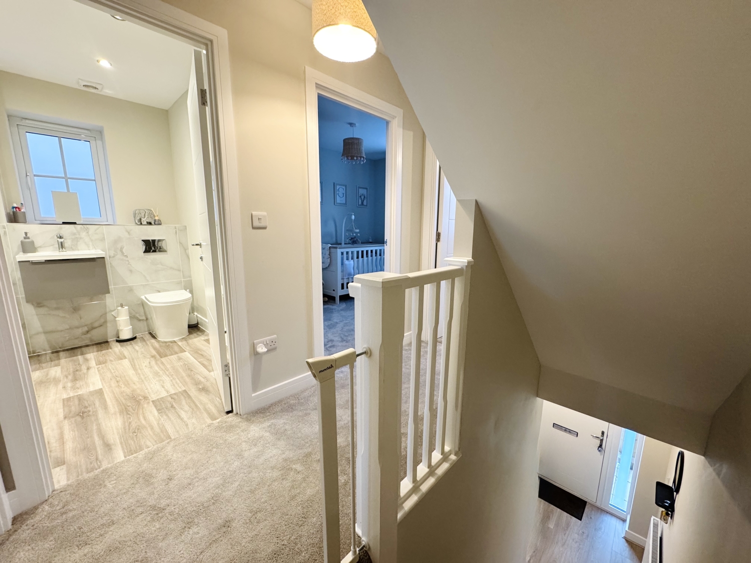 Stepping through the front door, you are welcomed by a bright entrance hallway with staircase leading to the upper floors. The heart of the home is the spacious 15ft open-plan kitchen/diner, fully fitted with quality units and integrated appliances from Howdens. This space flows seamlessly into the stylish living room, where patio doors open directly onto the rear garden, flooding the space with natural light. The ground floor also benefits from a conveniently located guest WC.