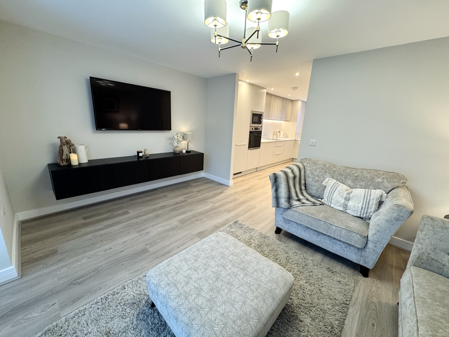 Fitted with a range of Howdens wall and base units with complementing work surfaces and splash backs, induction hob, extractor hood, integrated combination oven, integrated electric oven, integrated fridge/freezer, integrated dishwasher, integrated washing machine, boiler, inset composite sink with mixer tap, storage cupboard, radiator, spotlights to ceiling, laminate flooring, triple glazed window to the front elevation, opening into the living room