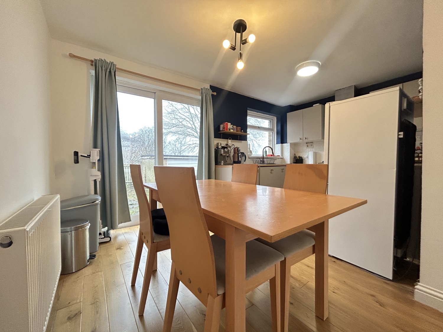 The accommodation begins with an entrance leading into a well-proportioned, light and airy lounge, which flows seamlessly into a pleasant dining room featuring patio doors that overlook the rear garden. The dining room offers open-plan access to a stylish, modern refitted kitchen complete with an integrated oven and hob with extractor hood, integrated dishwasher, and washing machine.