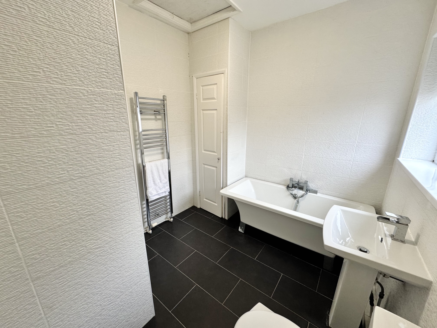 Fitted with a 3 piece suite comprising of; Bath with shower spray attachment, pedestal wash hand basin, low level w/c, heated towel rail, two storage cupboards, tiled walls, tiled flooring, double glazed window to the rear elevation