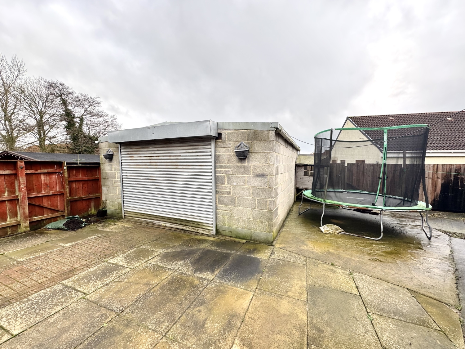 The dining room offers a dedicated space for family meals or entertaining with opening into the well‑designed kitchen, which provides ample storage, work surfaces, and room for appliances. A rear hallway leads from the main living areas and provides direct access to the outside, opening onto the extensive rear paved driveway and garden area. This rear access also connects conveniently to the impressive 19ft detached double garage, ideal for secure parking, storage, or workshop use.