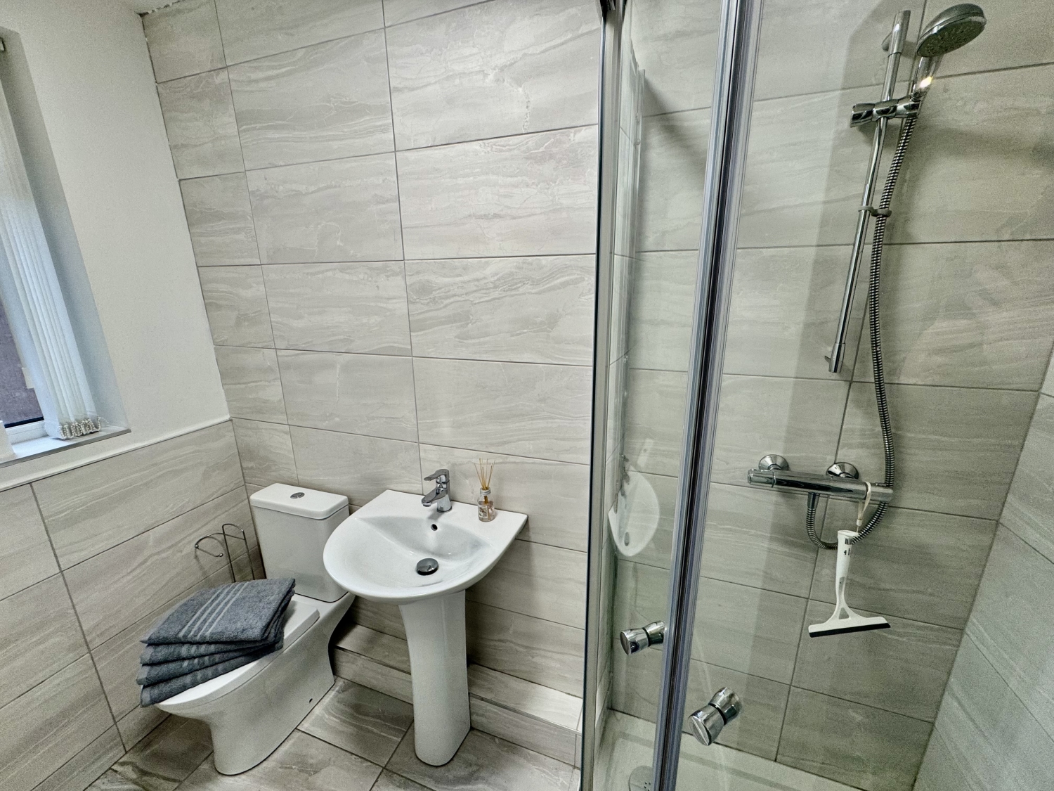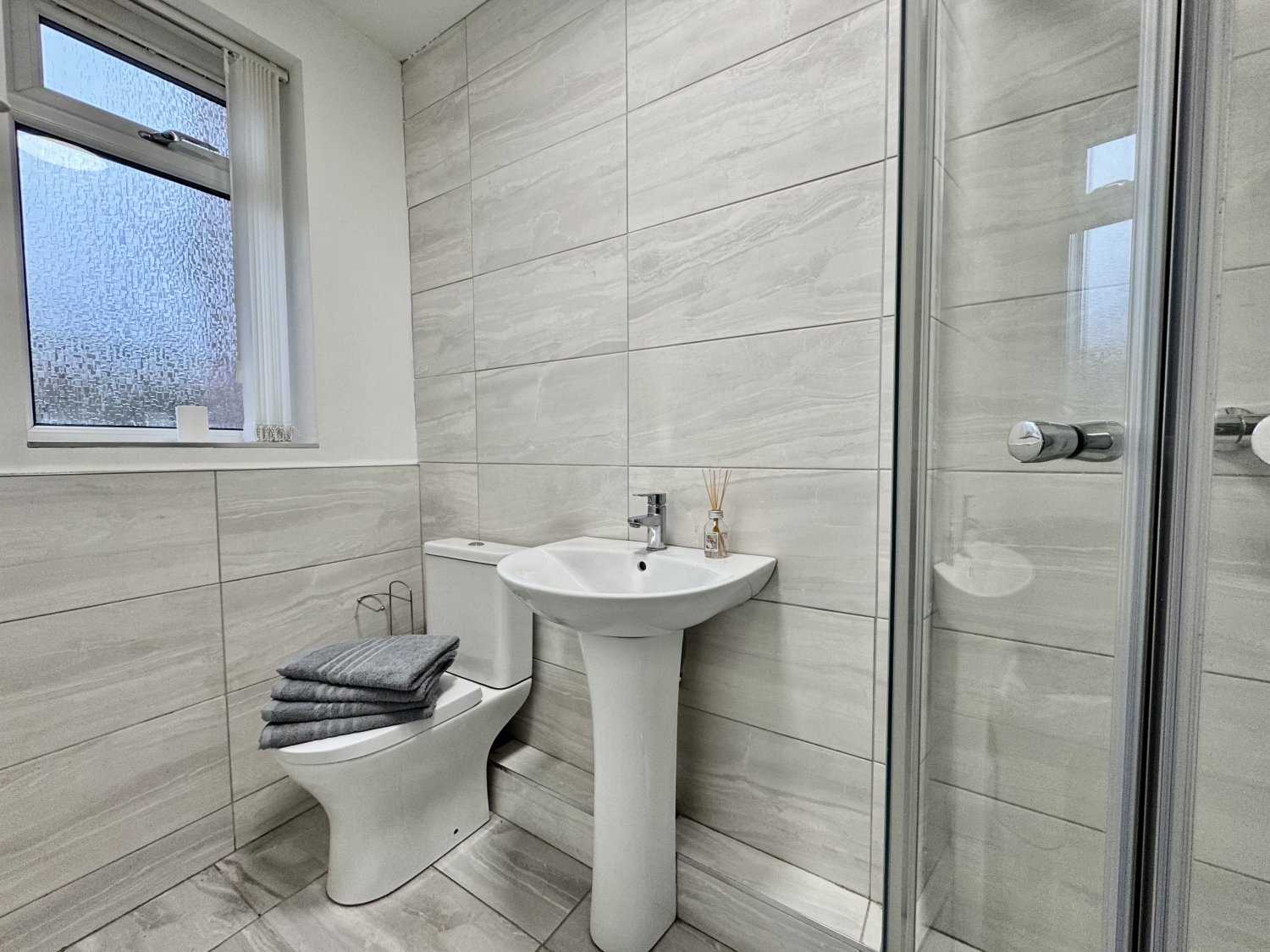 Three piece suite comprising of a low level w.c, pedestal wash hand basin with mixer tap, shower enclosure, radiator.