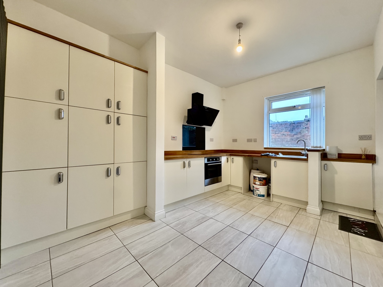 Double glazed window to the rear elevation, wall and base units, plumbing for an automatic washing machine, integrated oven, extractor hood, glass splash back, door leading through to the bathroom, door leading to the rear yard area .