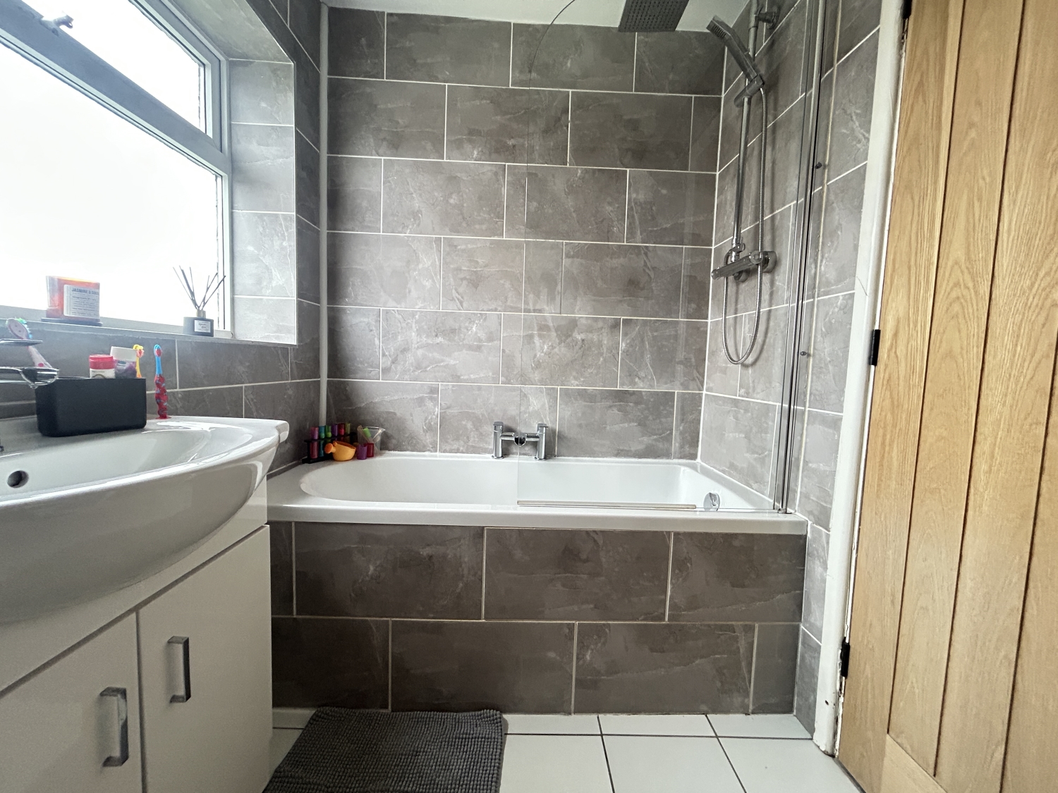 To the first floor are two well‑proportioned double bedrooms, both featuring fitted wardrobes, along with a stylish modern family bathroom complete with shower over bath.