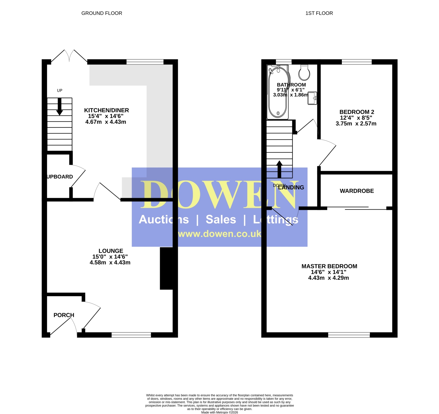 To the first floor, there are two well‑sized double bedrooms, with fitted wardrobes to the master, and a modern, elegant family bathroom with shower over bath.
