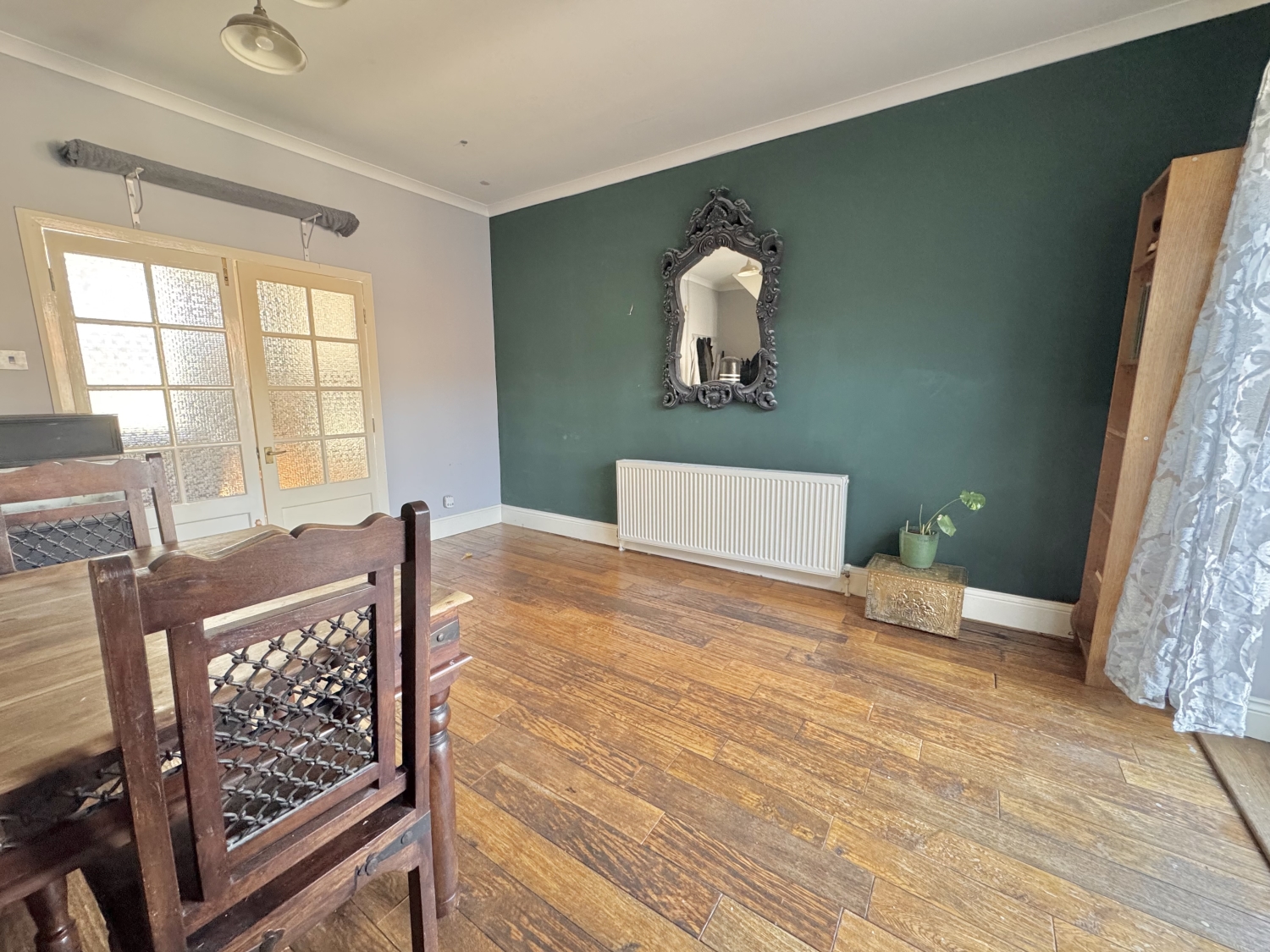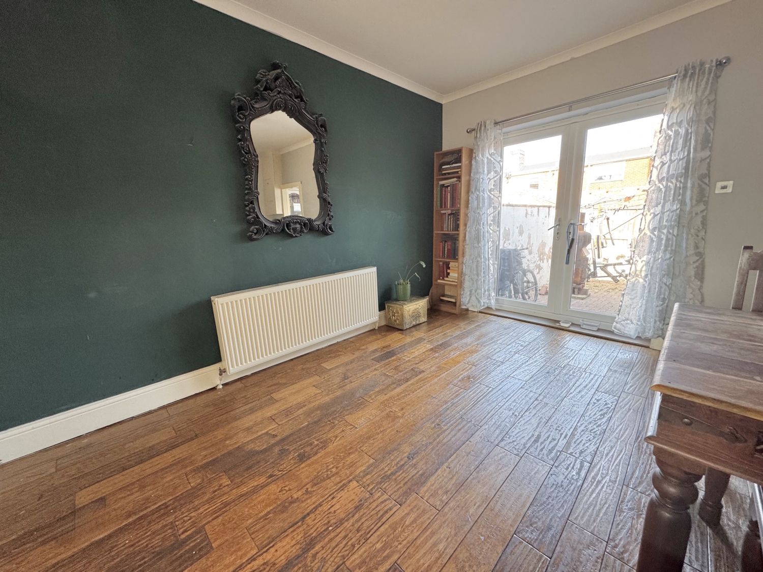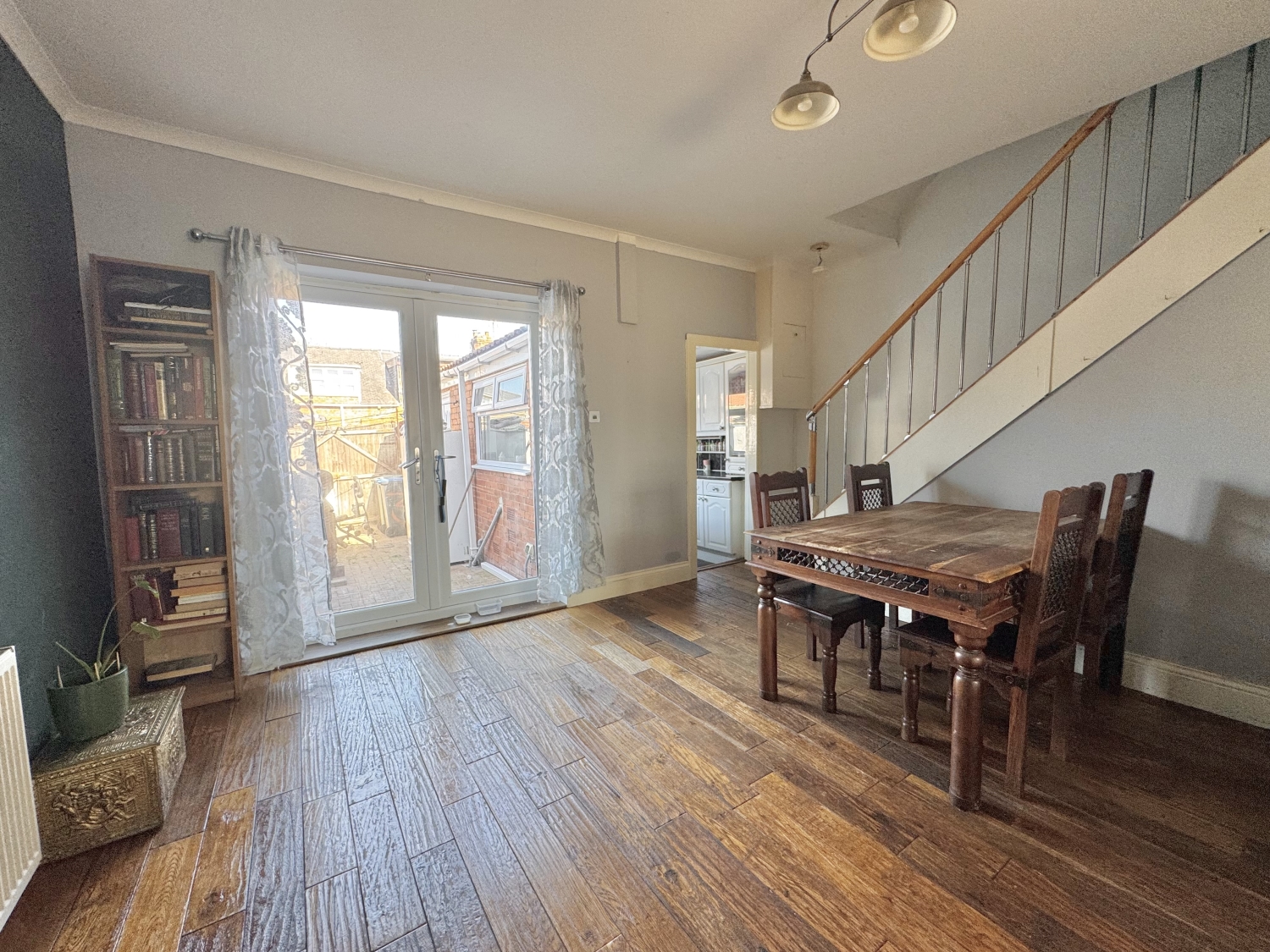 The accommodation begins with an entrance porch, leading into a bright lounge featuring a sunny‑aspect walk‑in bay window and wood flooring that continues seamlessly into the dining room. From here, stairs rise to the first floor, while double French doors open directly into the rear yard. A galley kitchen and rear lobby provide further access to the yard and lead through to the ground‑floor bathroom.
