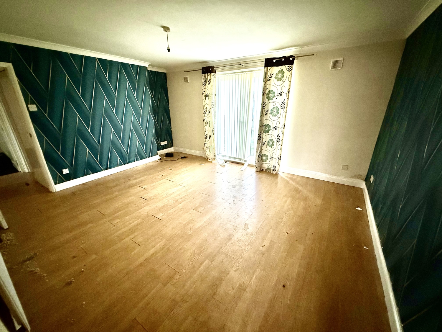 Laminate flooring, central heating radiator and textured ceiling.