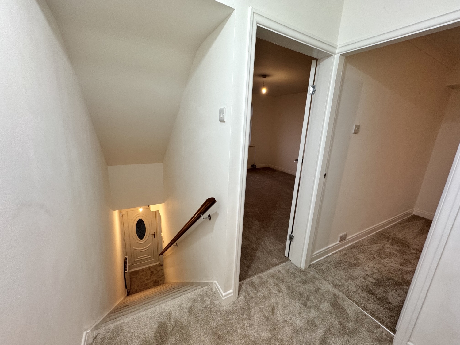 Upstairs, the landing gives access to two well‑proportioned double bedrooms. The master bedroom enjoys impressive sea views and includes a built‑in storage cupboard, while the second bedroom also offers generous space. The modern bathroom is fitted with a three‑piece suite comprising a bath with overhead shower, wash basin and WC, all finished in a clean, contemporary style.