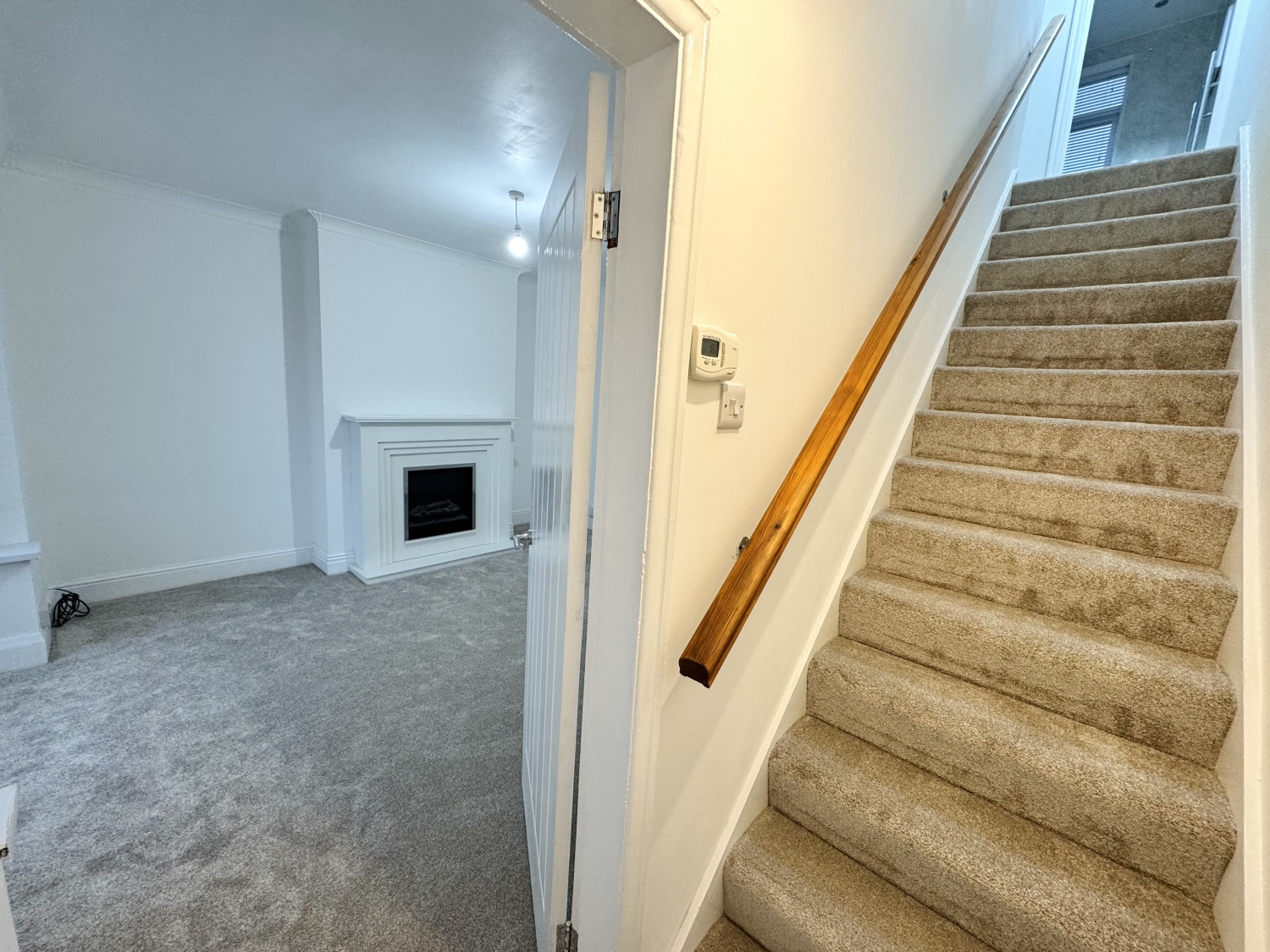 The property is approached via a front driveway, providing convenient off‑street parking. Stepping inside, an entrance porch leads into a welcoming hallway with stairs rising to the first‑floor landing. The living room sits to the front of the home and features a lovely bay window that fills the space with natural light, along with an electric fire that creates a cosy focal point. A second reception room offers additional versatility, complete with a useful storage cupboard and stylish feature panelling, making it ideal as a dining room, home office or snug.