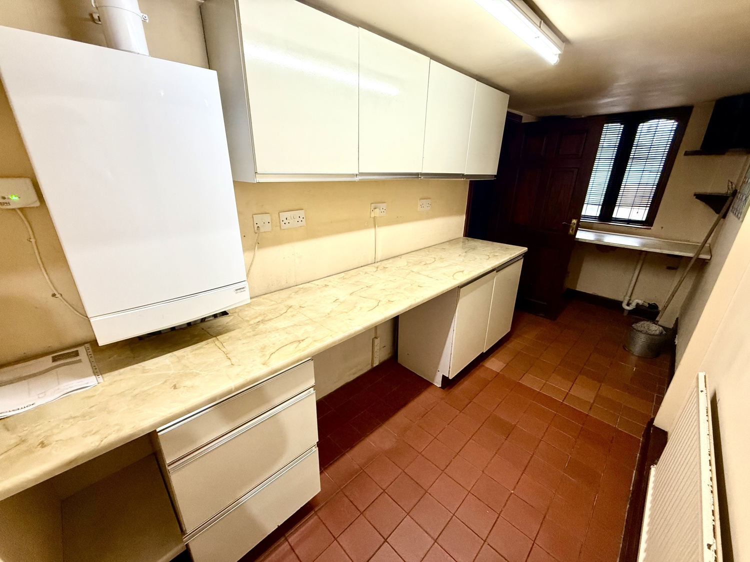 Fitted with a range of wall and base units, heat resisting work surfaces, quarry tile flooring, single central heating radiator, double glazed hardwood leaded window to the front and door leading to the garage.