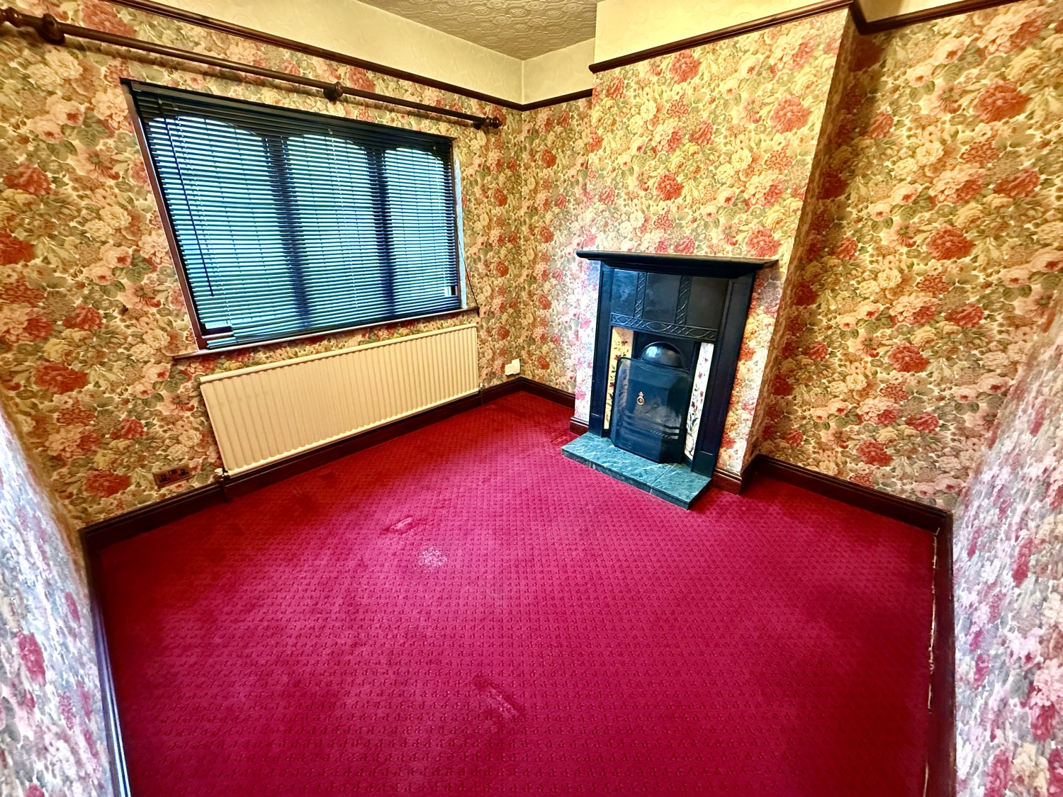 Double glazed leaded hardwood window to the front, single central heating radiator, period style feature fire place housing an open coal grade fire and picture rail.