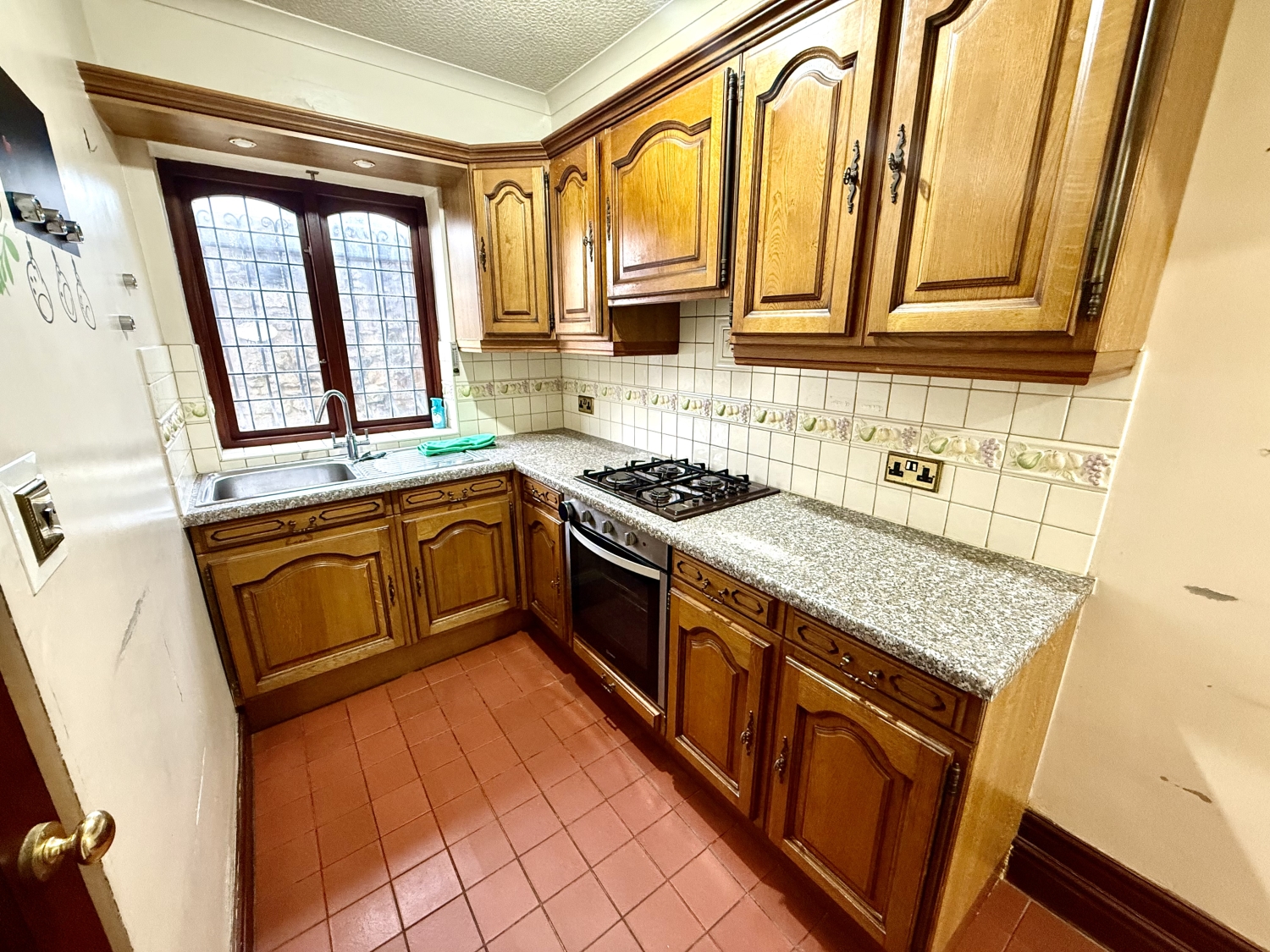 Fitted with a quality range of the shaker wall and base units, having contrasting work surfaces, incorporating a stainless steel sink unit with mixer tap and drainer. Double glazed leaded hardwood window to the side, splashback fruit motif tiling, quality tile flooring, built in oven, four ring gas hob and extractor hood and single central heating radiator.
