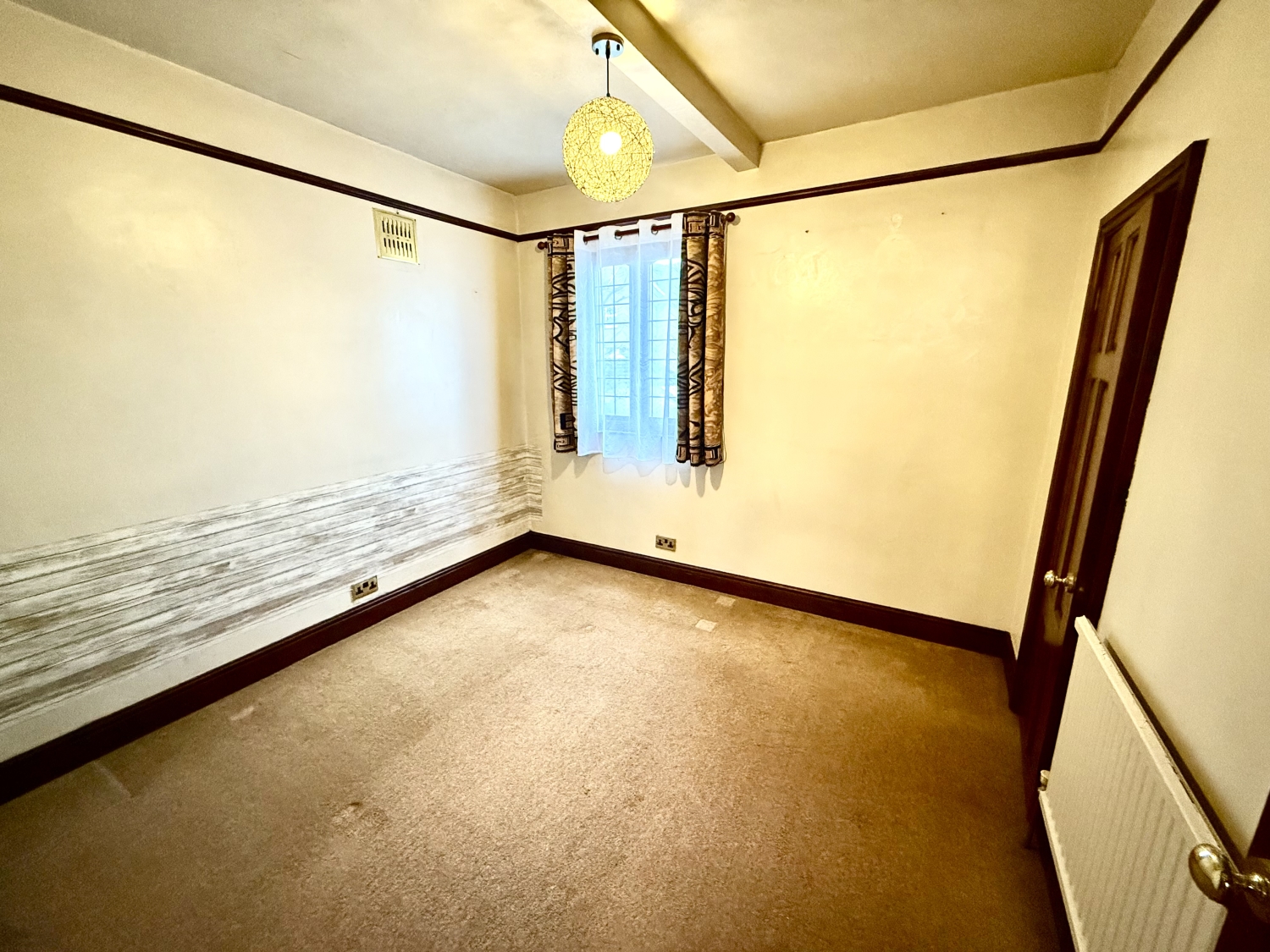 Double glazed hardwood leaded window to the side, single central heating radiator, picture rail and built in wardrobe with hanging rail.