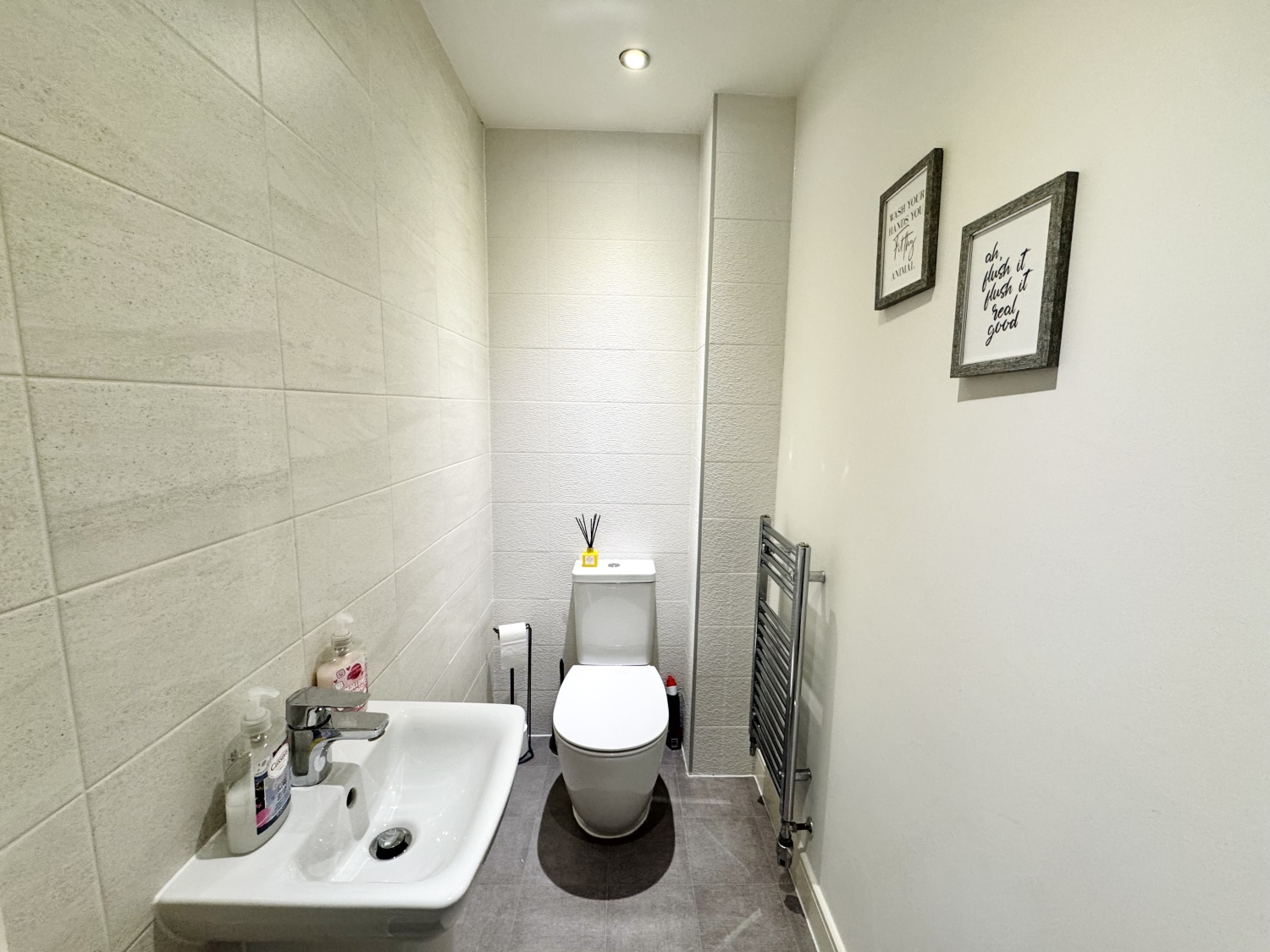 Low level w/c, wall mounted wash hand basin, heated towel rail, spotlights to ceiling, extractor fan, part tiled walls