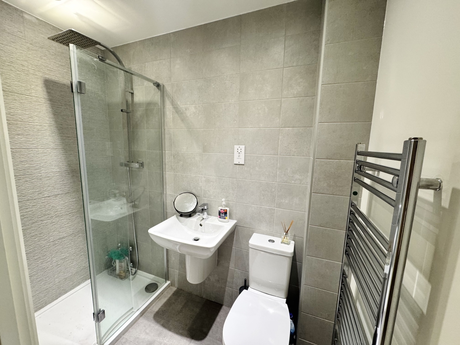 Fitted with a 3 piece suite comprising of; Double shower, wall mounted wash hand basin, low level w/c, heated towel rail, part tiled walls, spotlights to ceiling, extractor fan