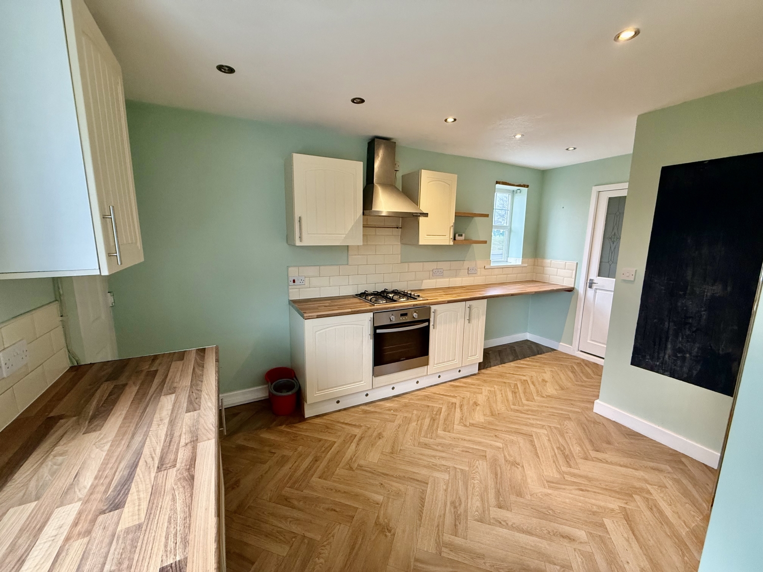 Fitted with a cream range of the shaker wall and base units, having contrasting work surfaces, incorporating a stainless steel sink unit with mixer tap and drainer. Built in oven, four ring gas hob and stainless steel extractor hood, double glazed UPVC window to the side and also to the rear, splashback tiling, downlighters, kickboard lighting, bespoke central heating radiator and under stair storage cupboard.