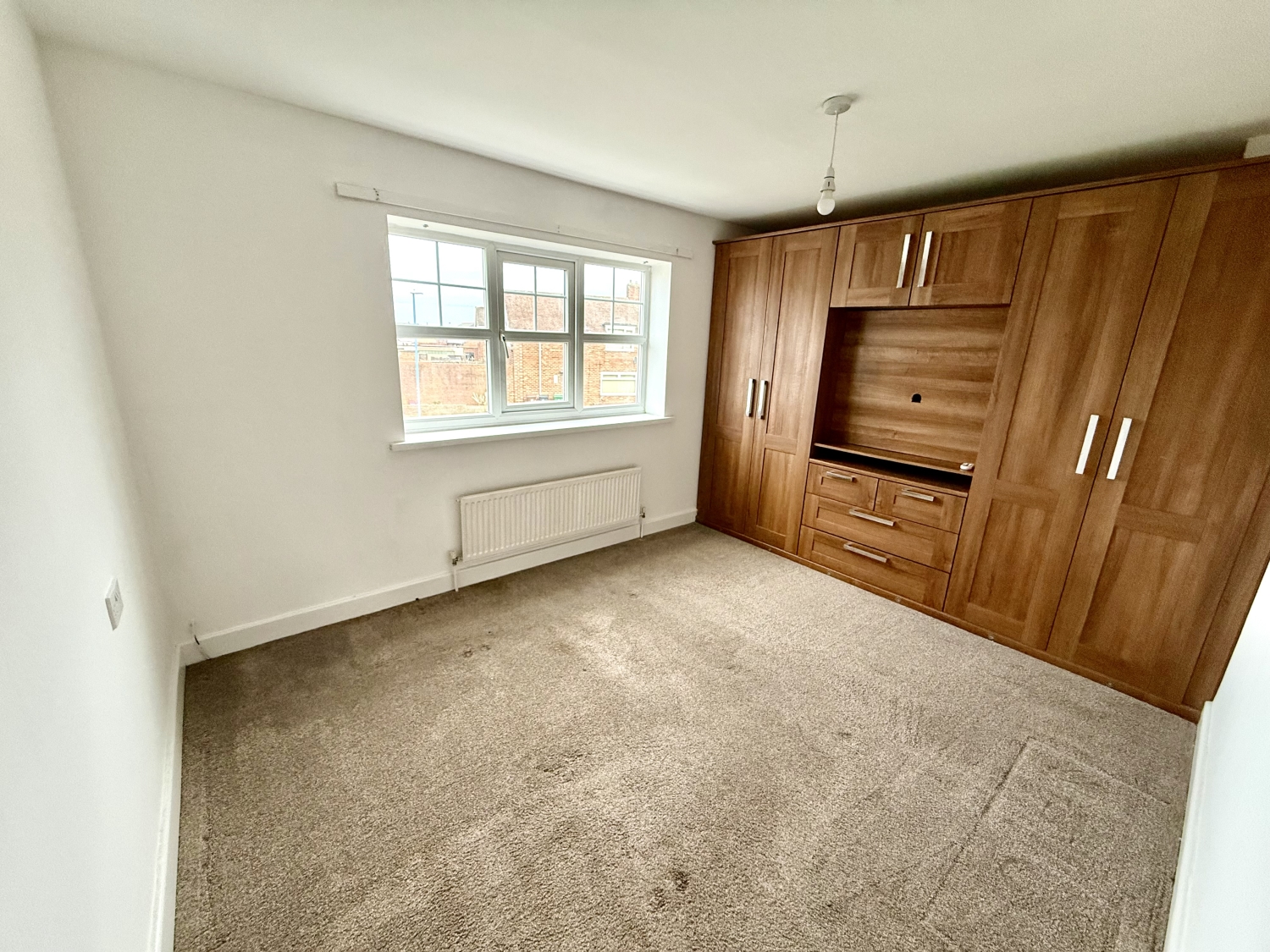 Double glazed UPVC window to the front, single central heating radiator, a range of the fitted wardrobes and vanity area.