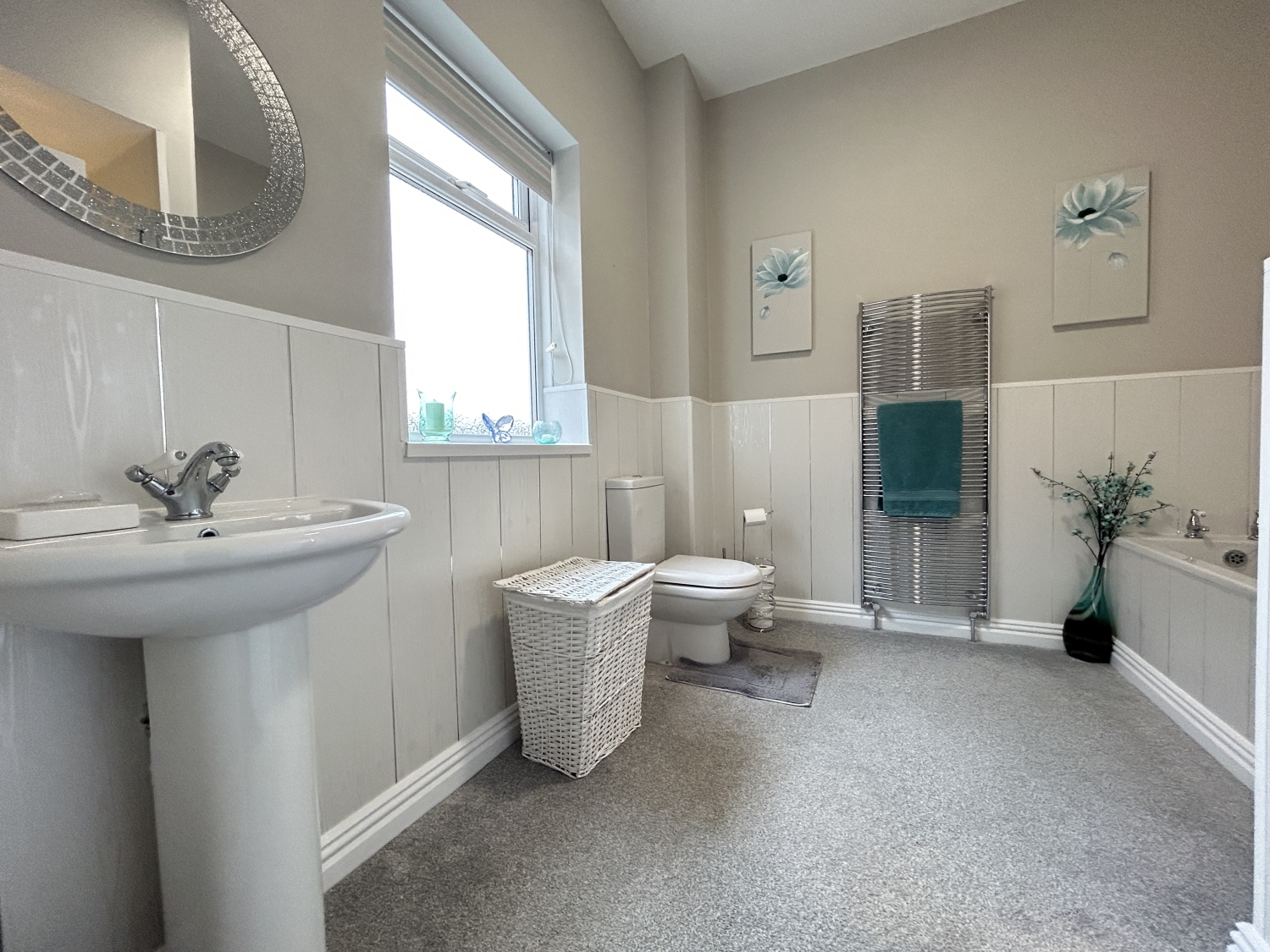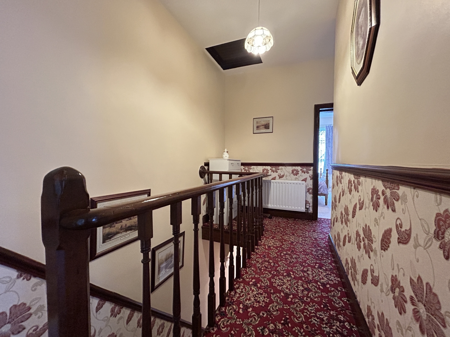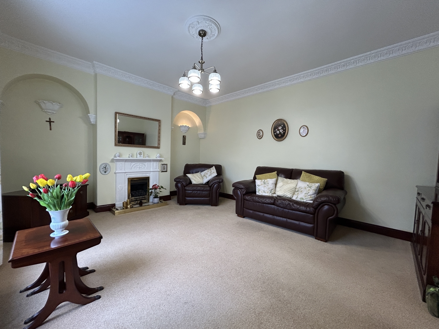 Accommodation: The entrance porch and hallway—with its striking corbel arch—lead into a spacious lounge featuring a decorative gas fireplace. A separate dining room offers a beautiful marble fireplace and ample room for a large family dining table. The modern refitted kitchen sits to the rear, accompanied by a rear hall with built in storage and access to a separate WC and a highly practical ground-floor shower room/utility room.