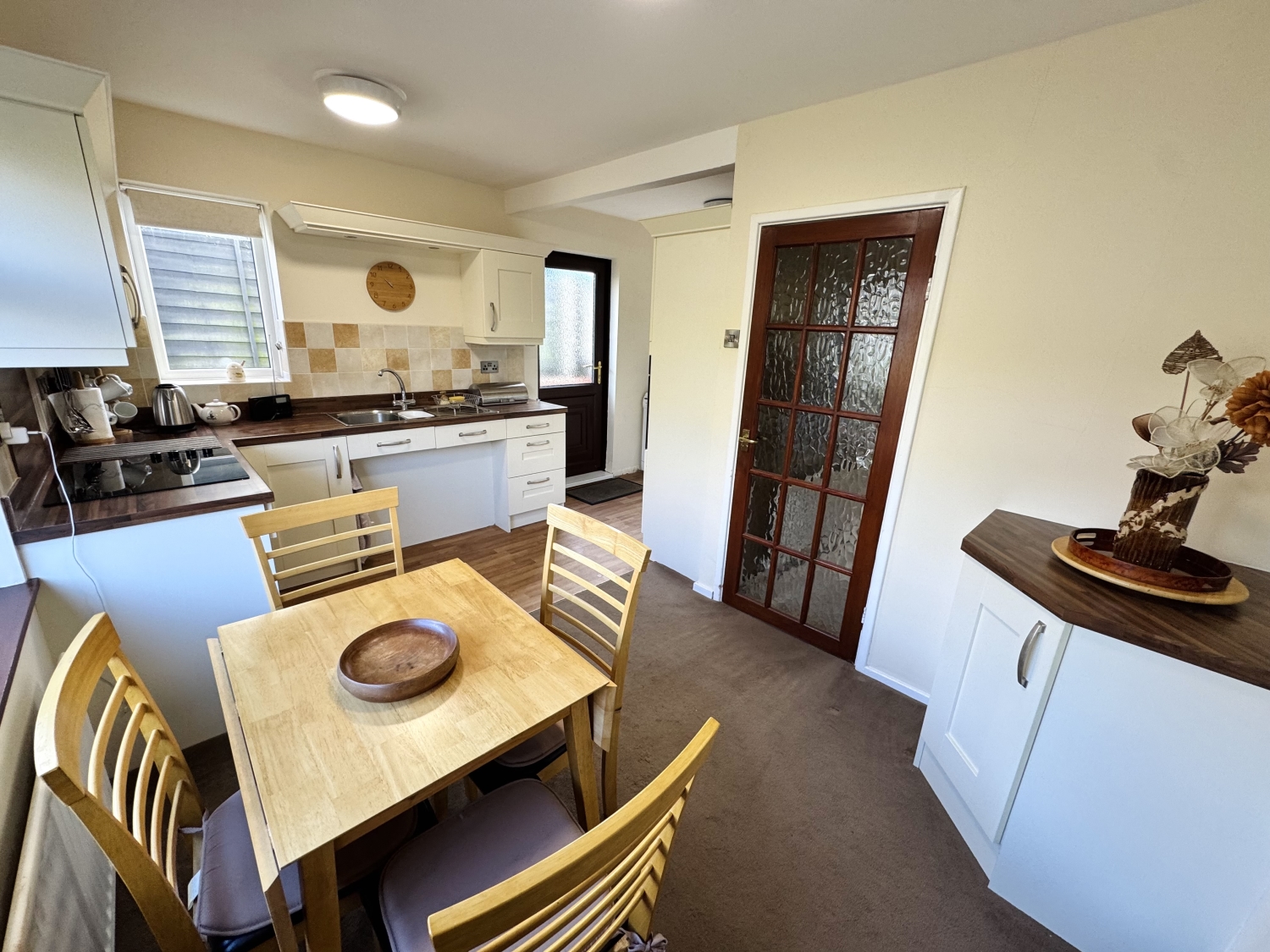 Fitted with a range of wall and base units with complementing work surfaces, splash back tiling, electric hob, electric oven, extractor hood, stainless steel sink with drainer and mixer tap, space for fridge/freezer, space for washing machine, space for dryer, storage cupboard, radiator, upvc door to the side elevation, double glazed windows to the side and rear elevation