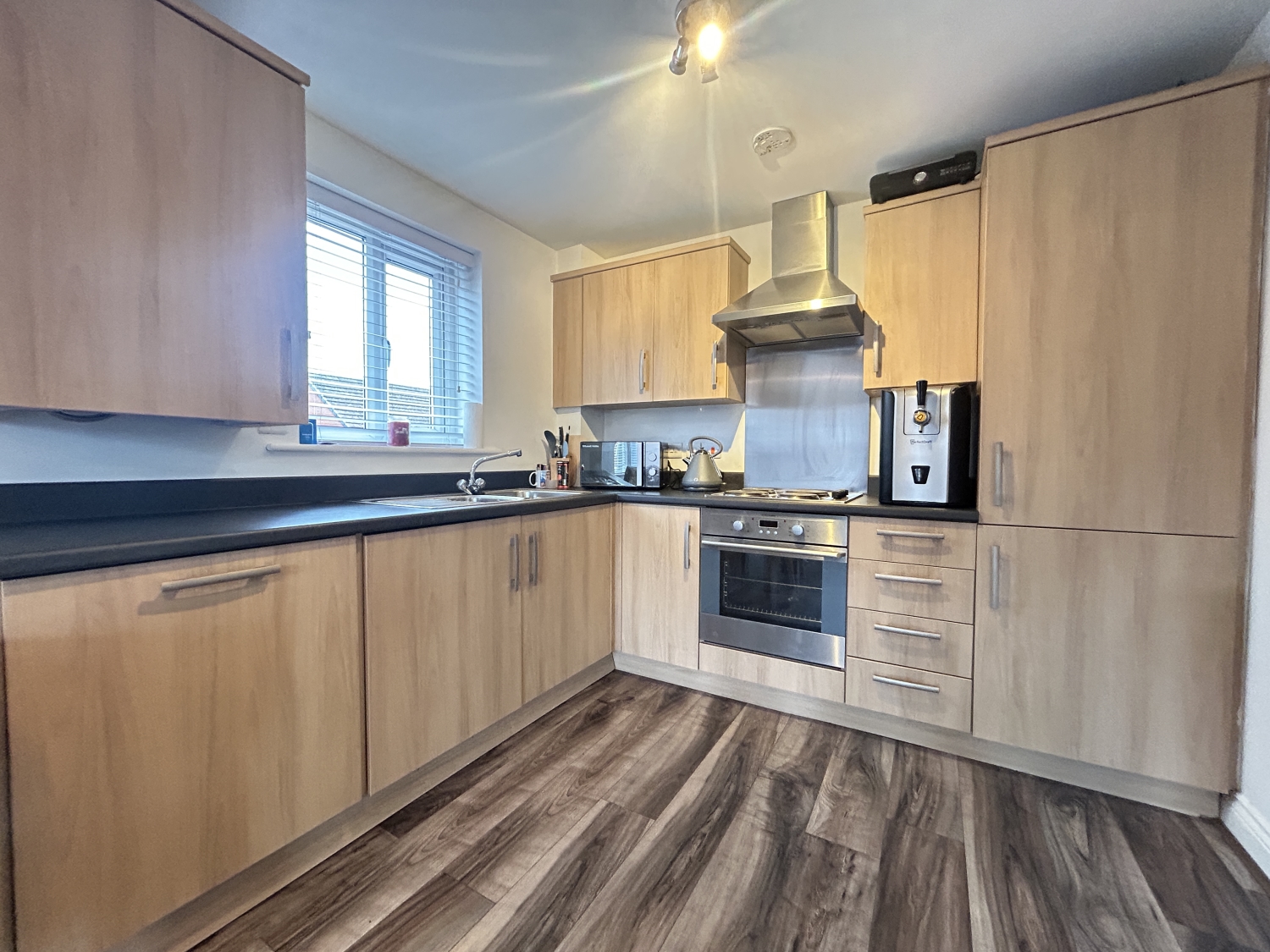 Upon entering the building, a secure communal entrance leads into a welcoming private hallway with built-in storage. The impressive open-plan living area provides a bright and sociable space, enhanced by double-glazed windows to the front aspect. The stylish fitted kitchen features modern wall and base units, contrasting worktops, and integrated appliances including an electric oven, hob with extractor hood, integrated fridge freezer, washing machine and dishwasher. The contemporary open plan living space provides an ideal for relaxed living and entertaining.