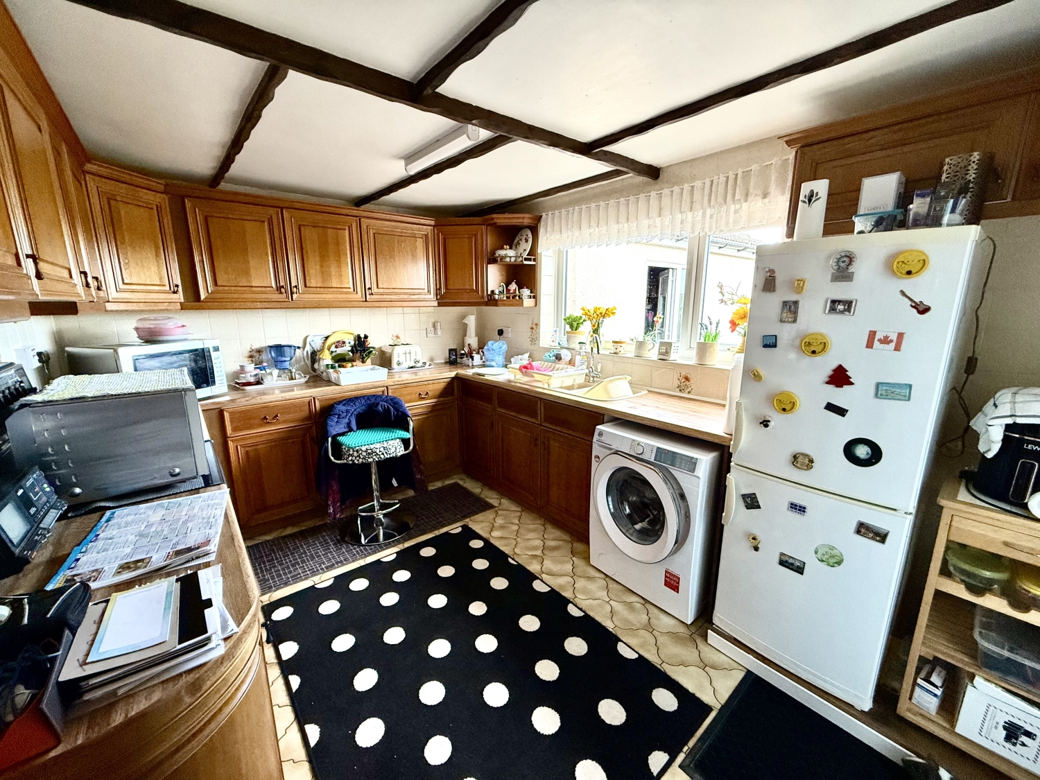 Fitted with a range of wall and base units, having contrasting work surfaces, incorporating a coloured sink unit with mixer tap and drainer. Splashback tiling, tiled flooring, plumbing for an automatic washing machine, double glazed window to the rear, central heating radiator, uPVC external door, beamed effect ceiling and extractor hood.