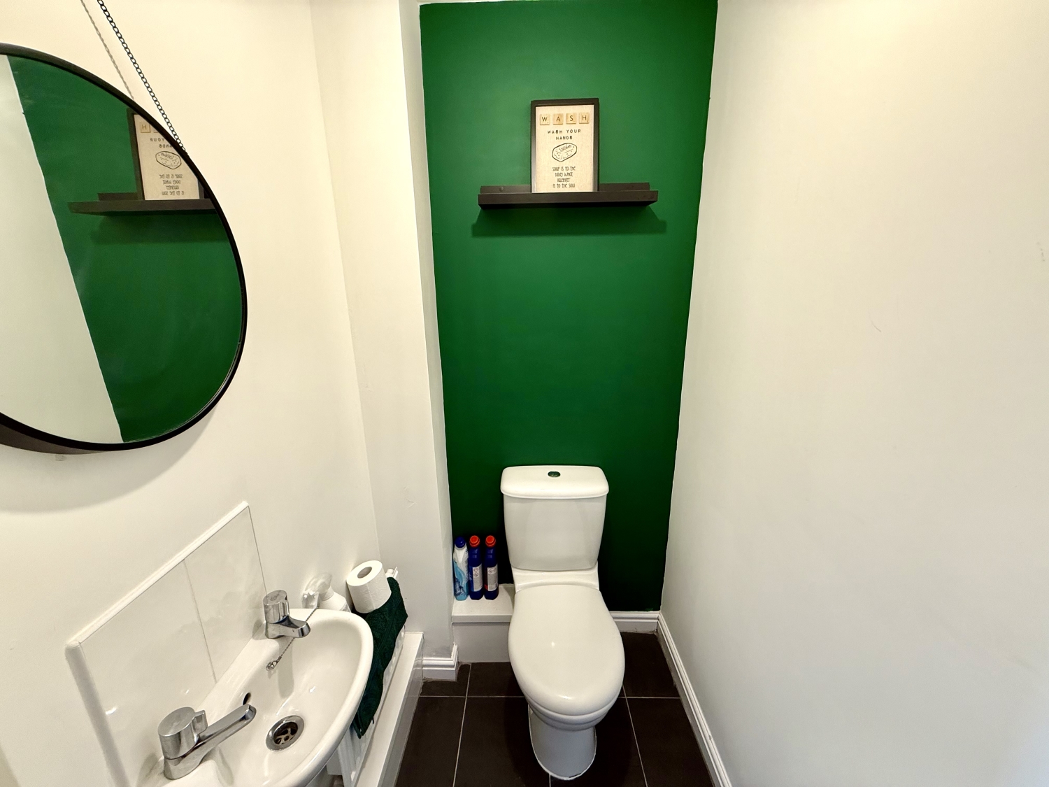 Fitted with a two piece suite comprising a low level WC and wash hand basin. Central heating radiator, tiled flooring and extractor fan.
