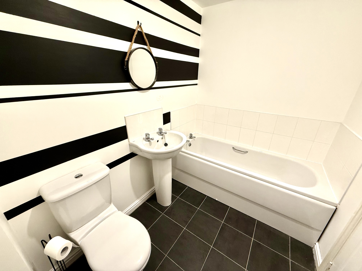 Fitted with a white three piece suite comprising a panel bath, pedestal wash hand basin and low level WC. Splashback tiling, central heating radiator and tiled flooring.