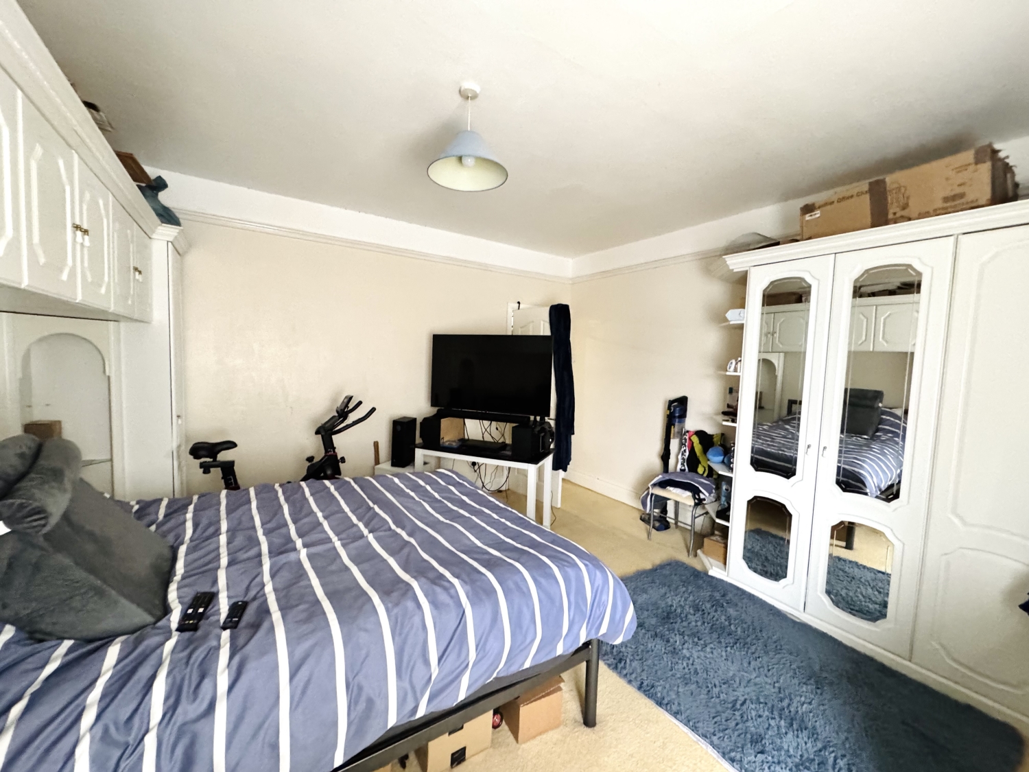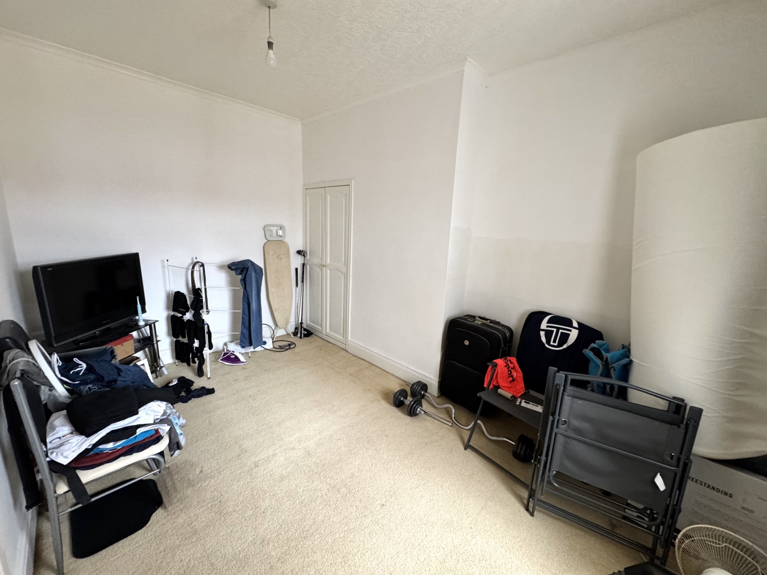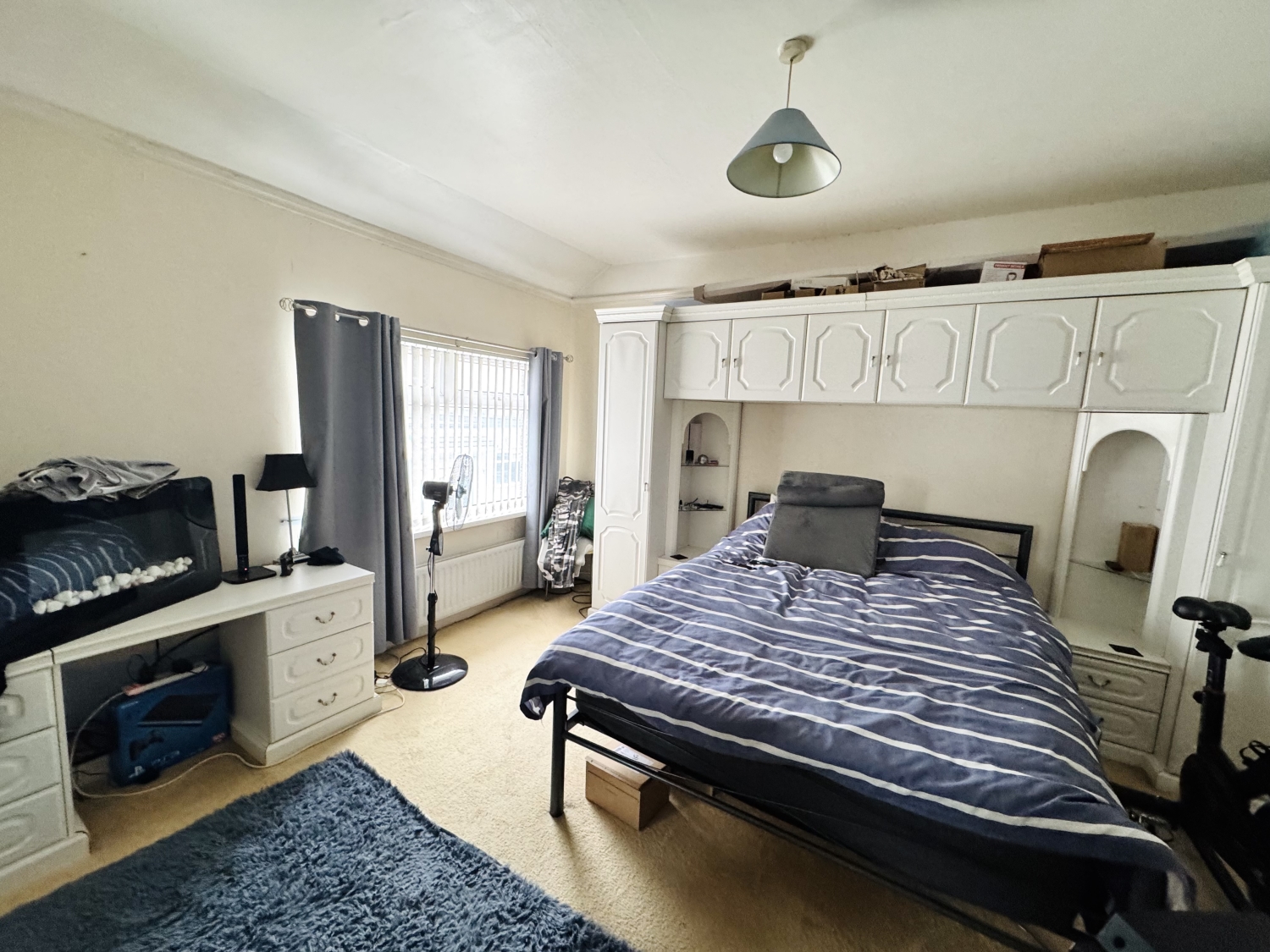 Storage cupboard, radiator, patio doors to the rear yard